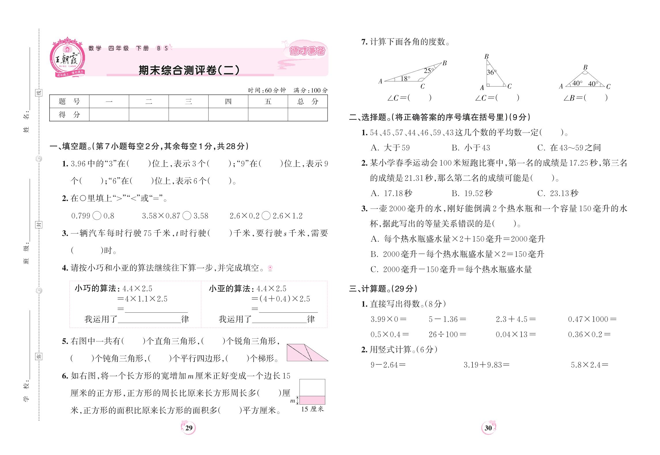 2022下册四年级数学北师版 期末综合测评卷(二)