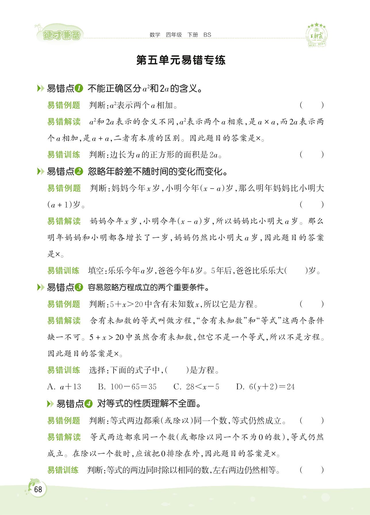 2022下册四年级数学北师版 第五单元 认识方程——第五单元易错专练