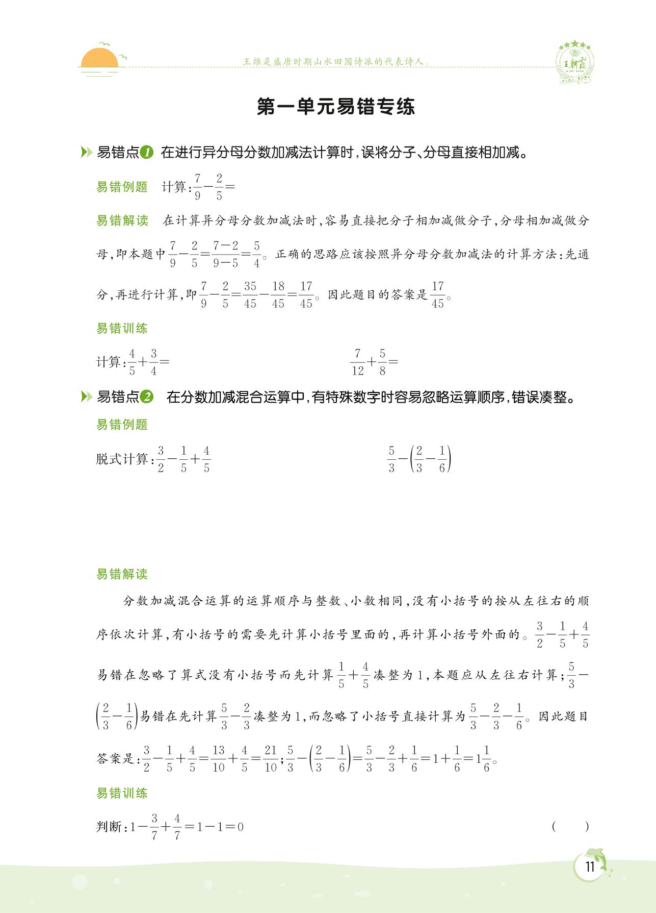 2022下册五年级数学北师版 第一单元 分数加减法——第一单元易错专练