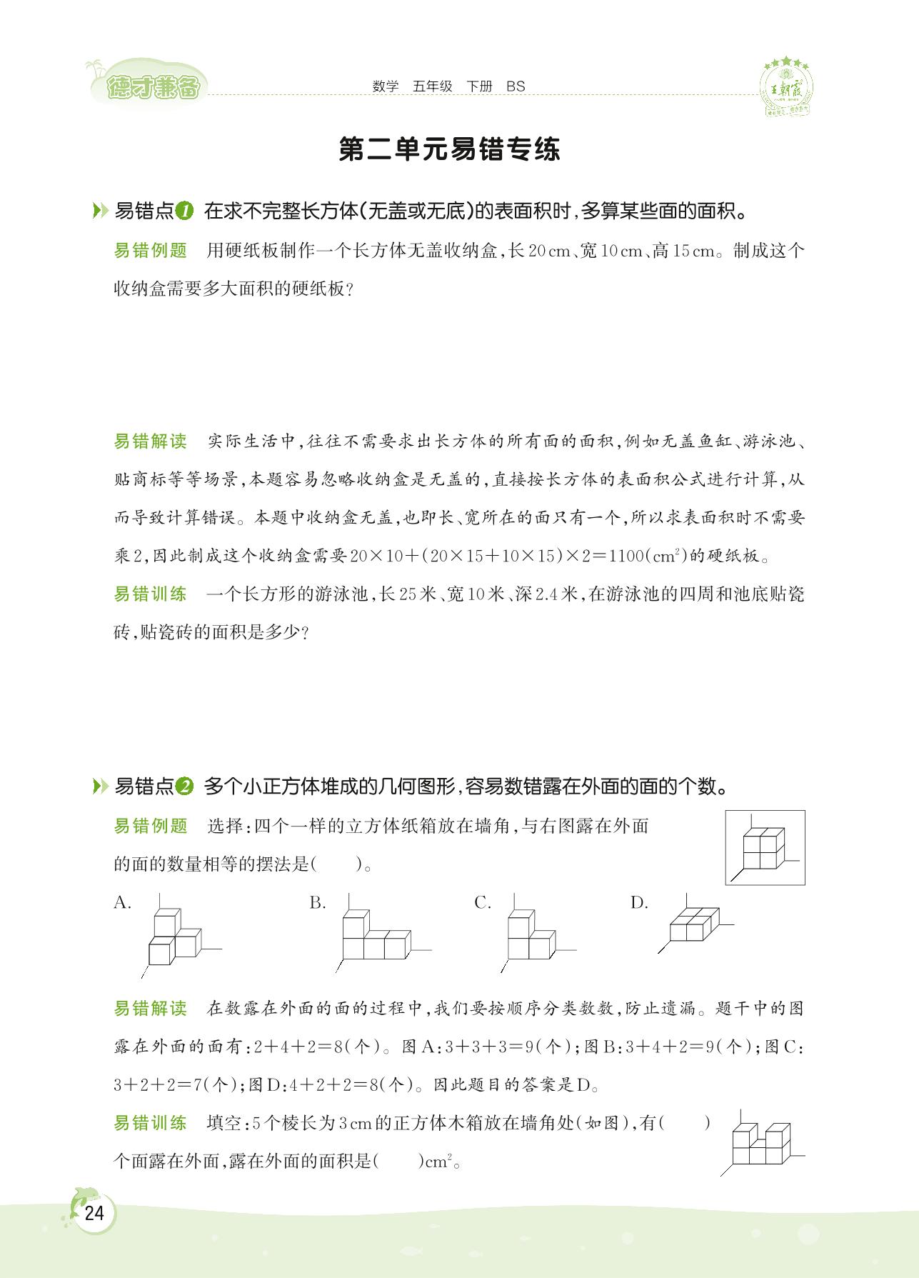 2022下册五年级数学北师版 第二单元 长方体(一)——第二单元易错专练