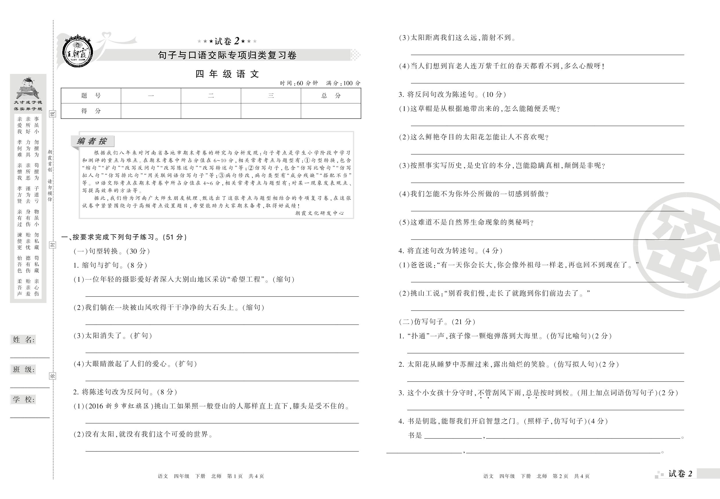 王朝霞期末专项卷——句子与口语交际专项归类复习卷四年级下册语文(北师版)_R210801230403【2】