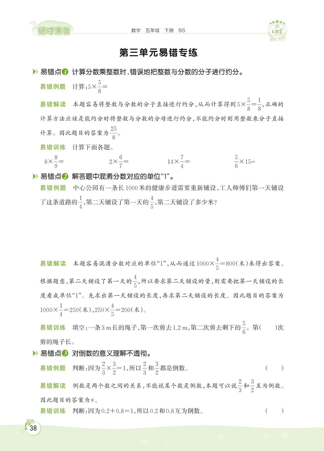 2022下册五年级数学北师版 第三单元 分数乘法——第三单元易错专练