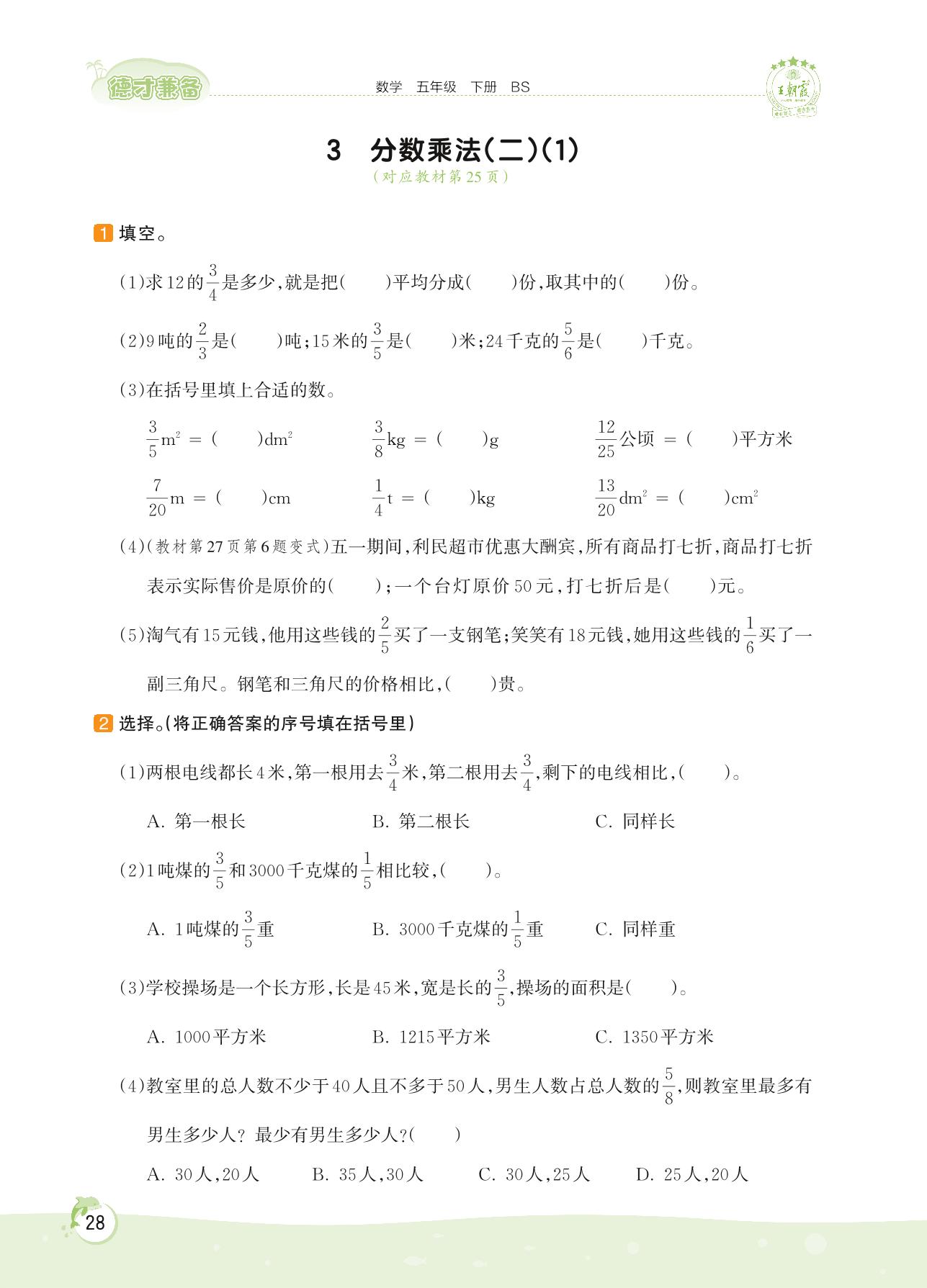 2022下册五年级数学北师版 第三单元 分数乘法——3 分数乘法(二)(1)