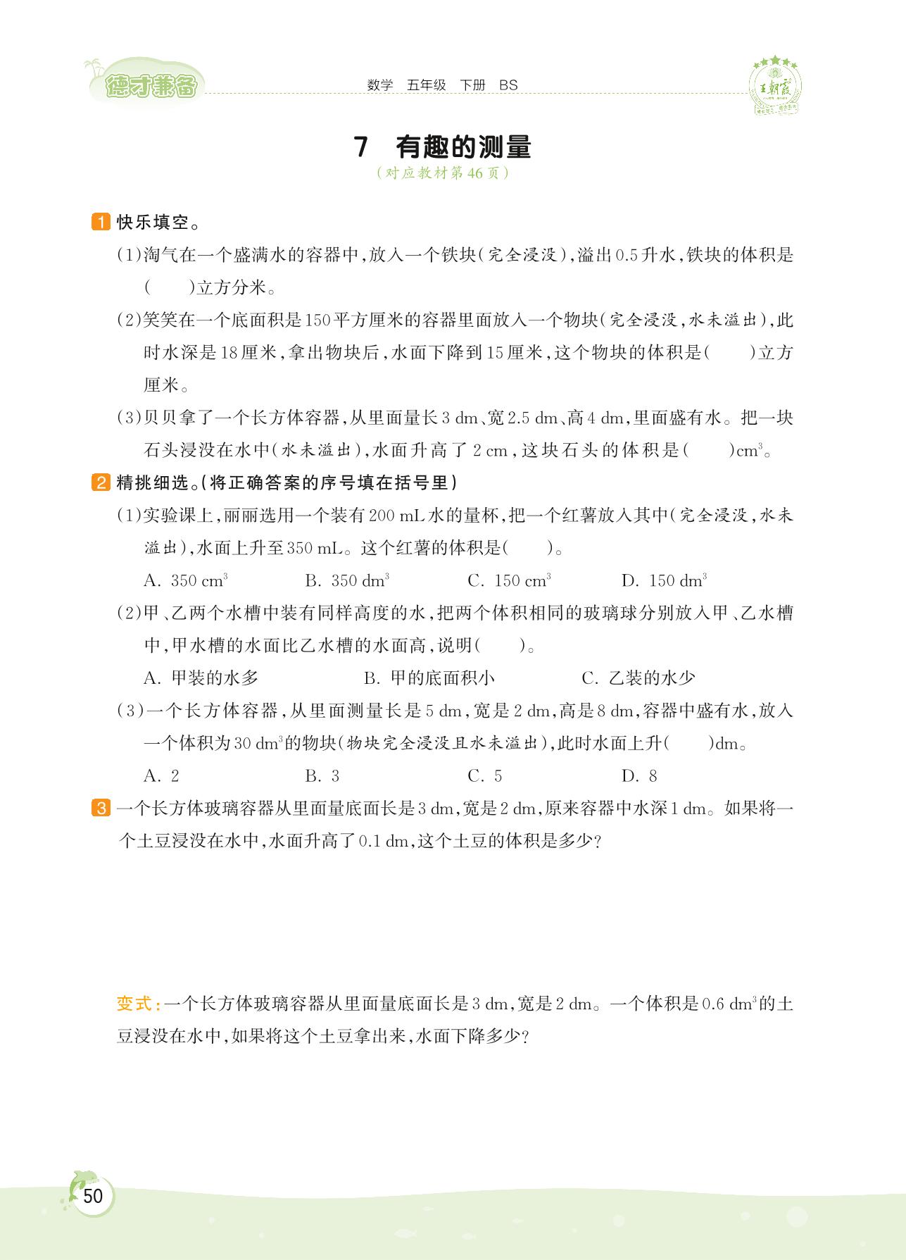 2022下册五年级数学北师版 第四单元 长方体(二)——7 有趣的测量