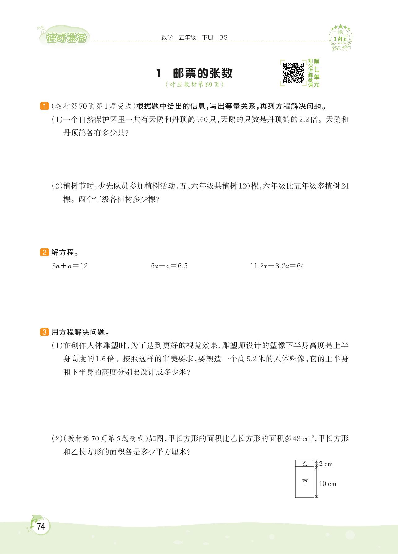 2022下册五年级数学北师版 第七单元 用方程解决问题——1 邮票的张数
