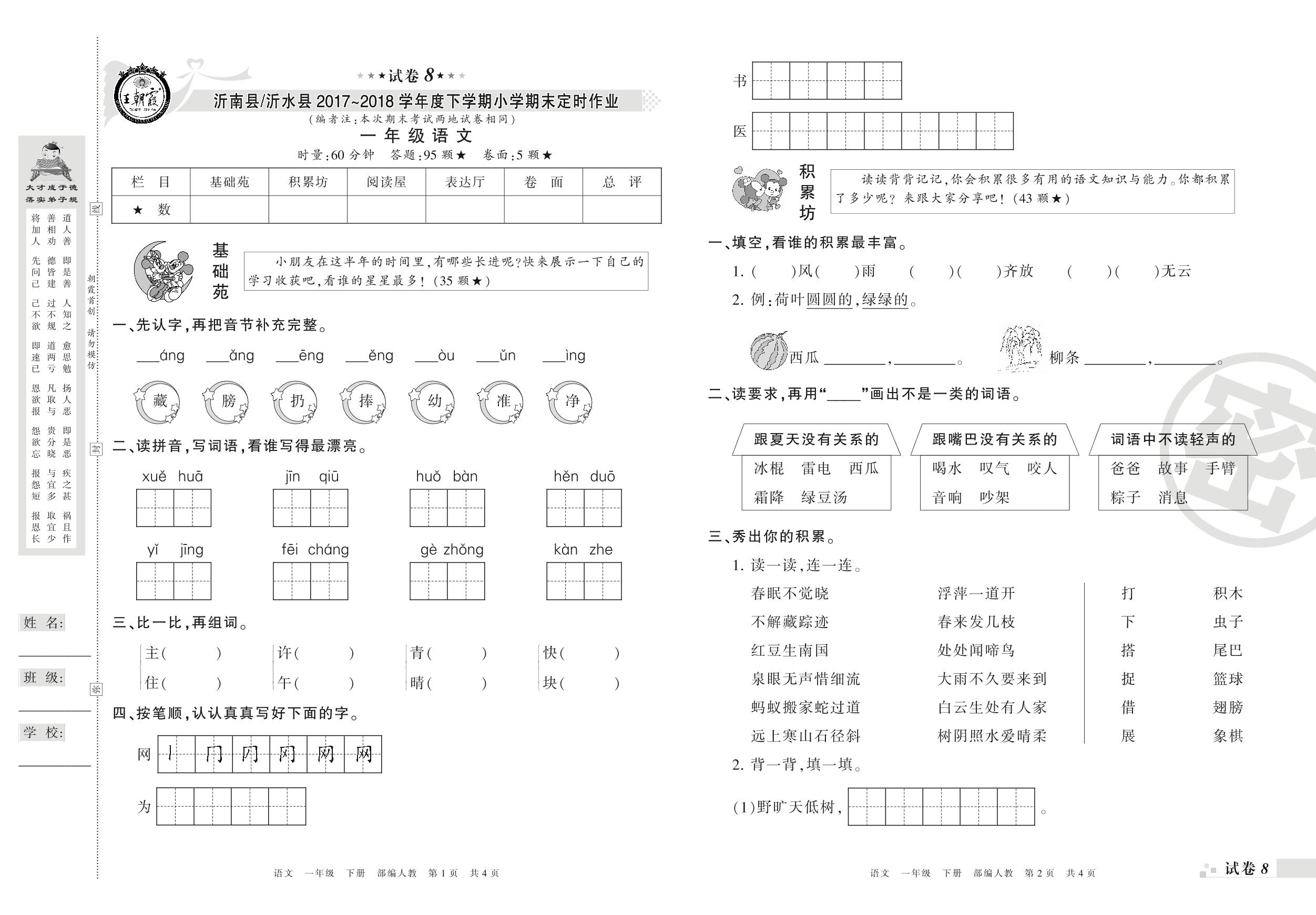 2017-2018学年第二学期临沂市沂南县(沂水县)一年级语文试卷(人教版)【8】