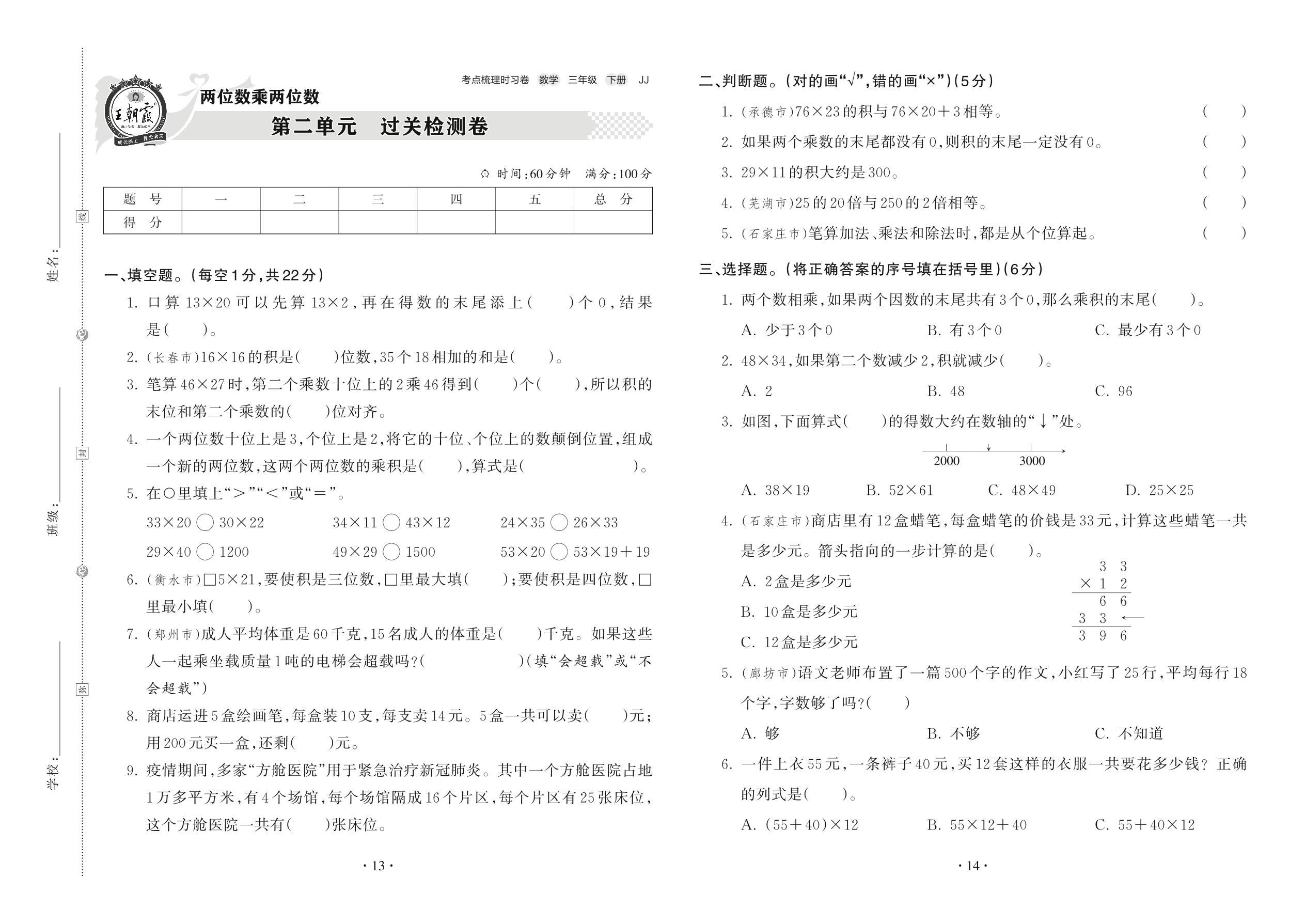 2022下册三年级数学冀教版 第二单元 过关检测卷