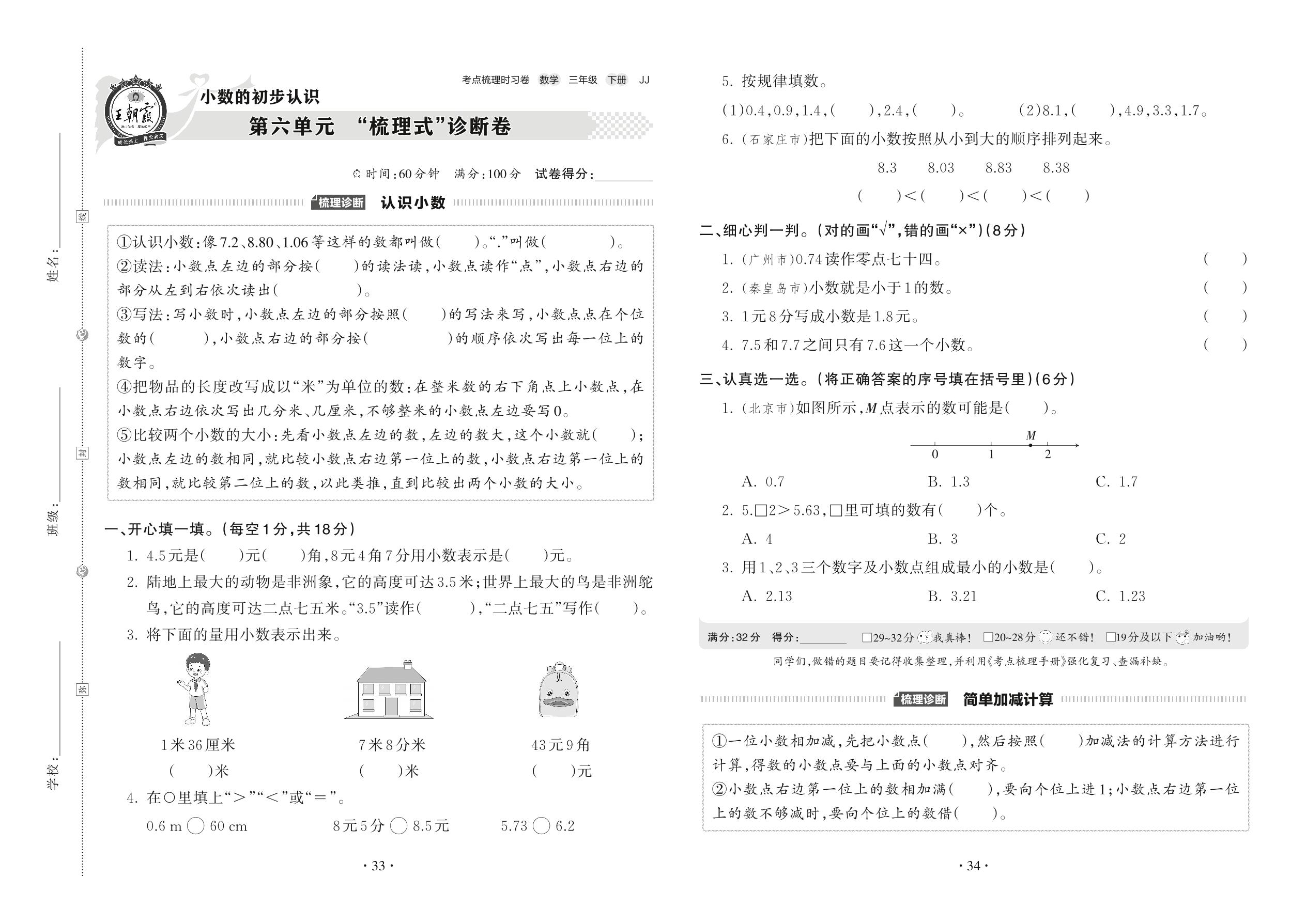 2022下册三年级数学冀教版 第六单元 “梳理式”诊断卷
