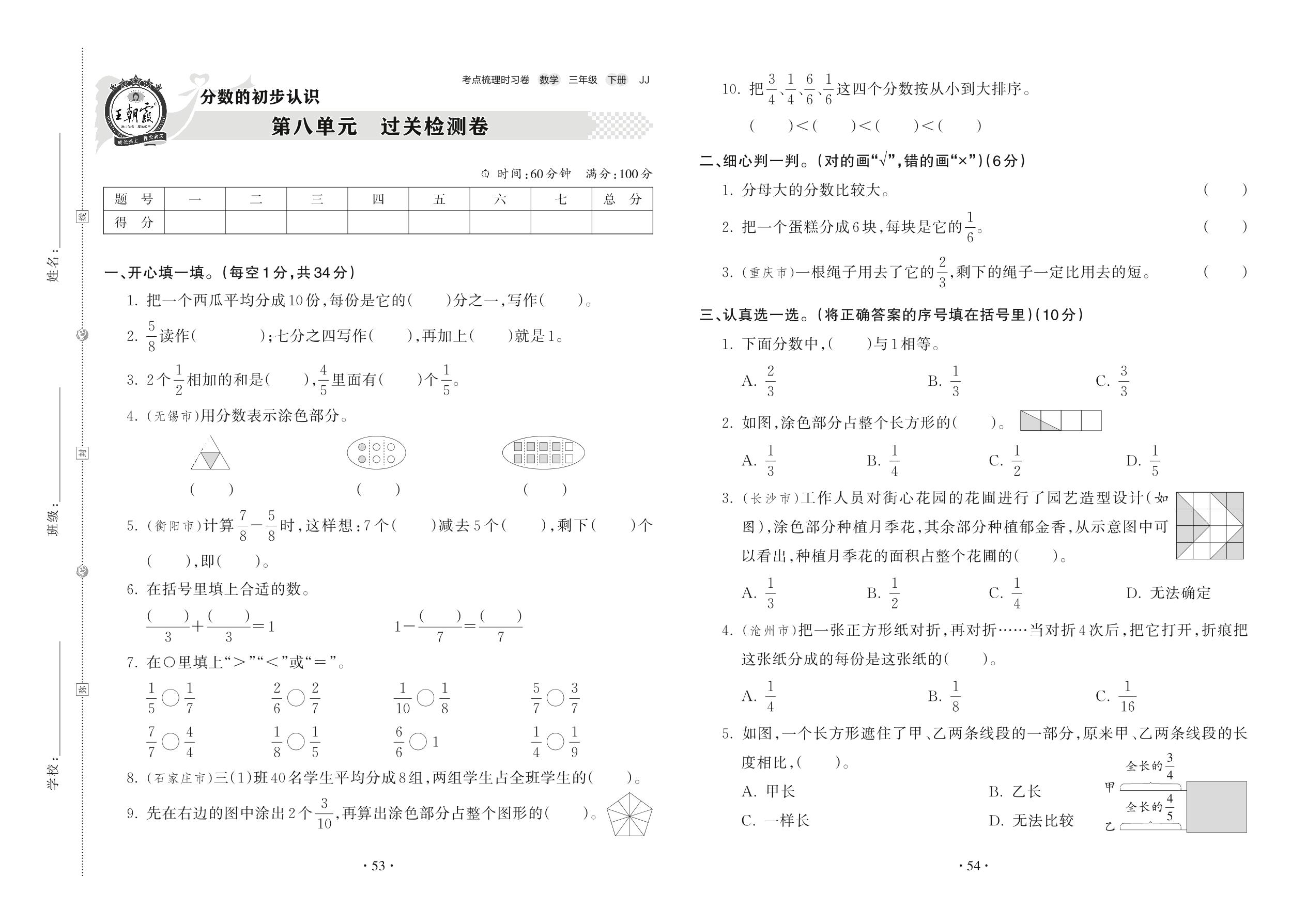 2022下册三年级数学冀教版 第八单元 过关检测卷