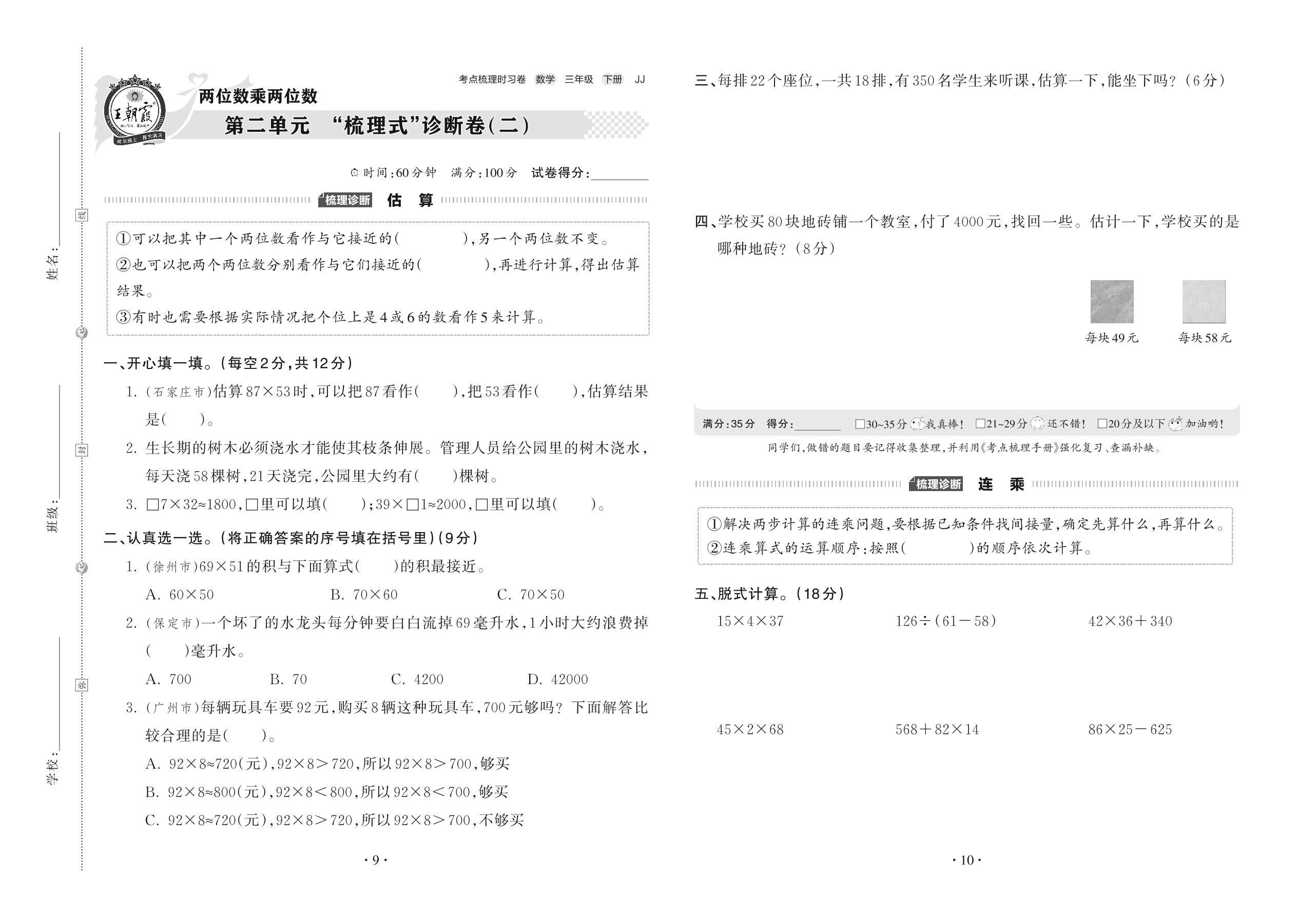 2022下册三年级数学冀教版 第二单元 “梳理式”诊断卷(二)
