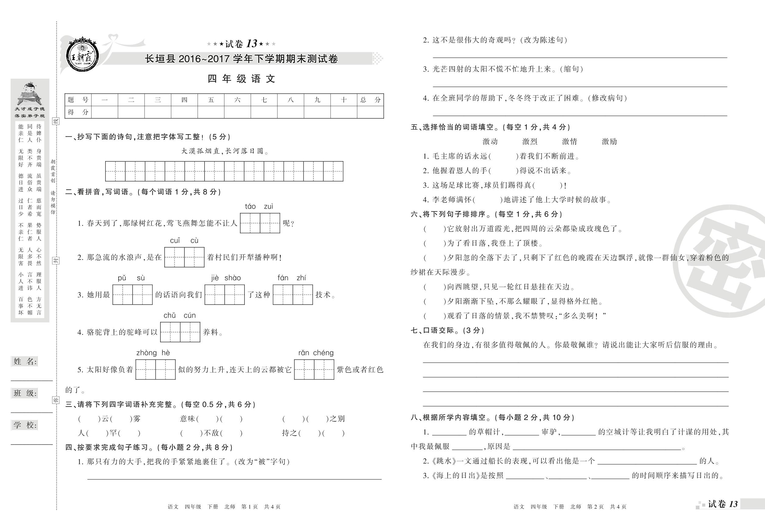 2016-2017学年第二学期新乡市长垣县四年级语文试卷(北师版)【13】