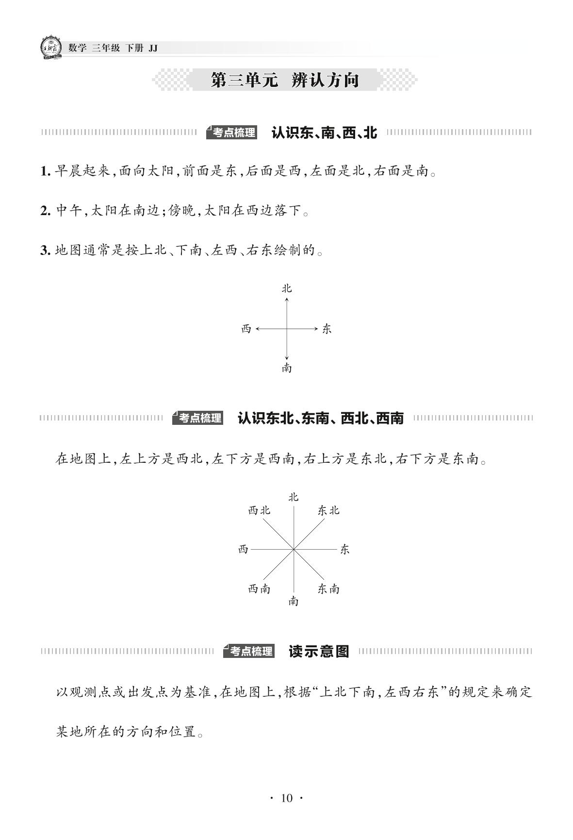 2022下册三年级数学冀教版 单元考点梳理——第三单元 辨认方向