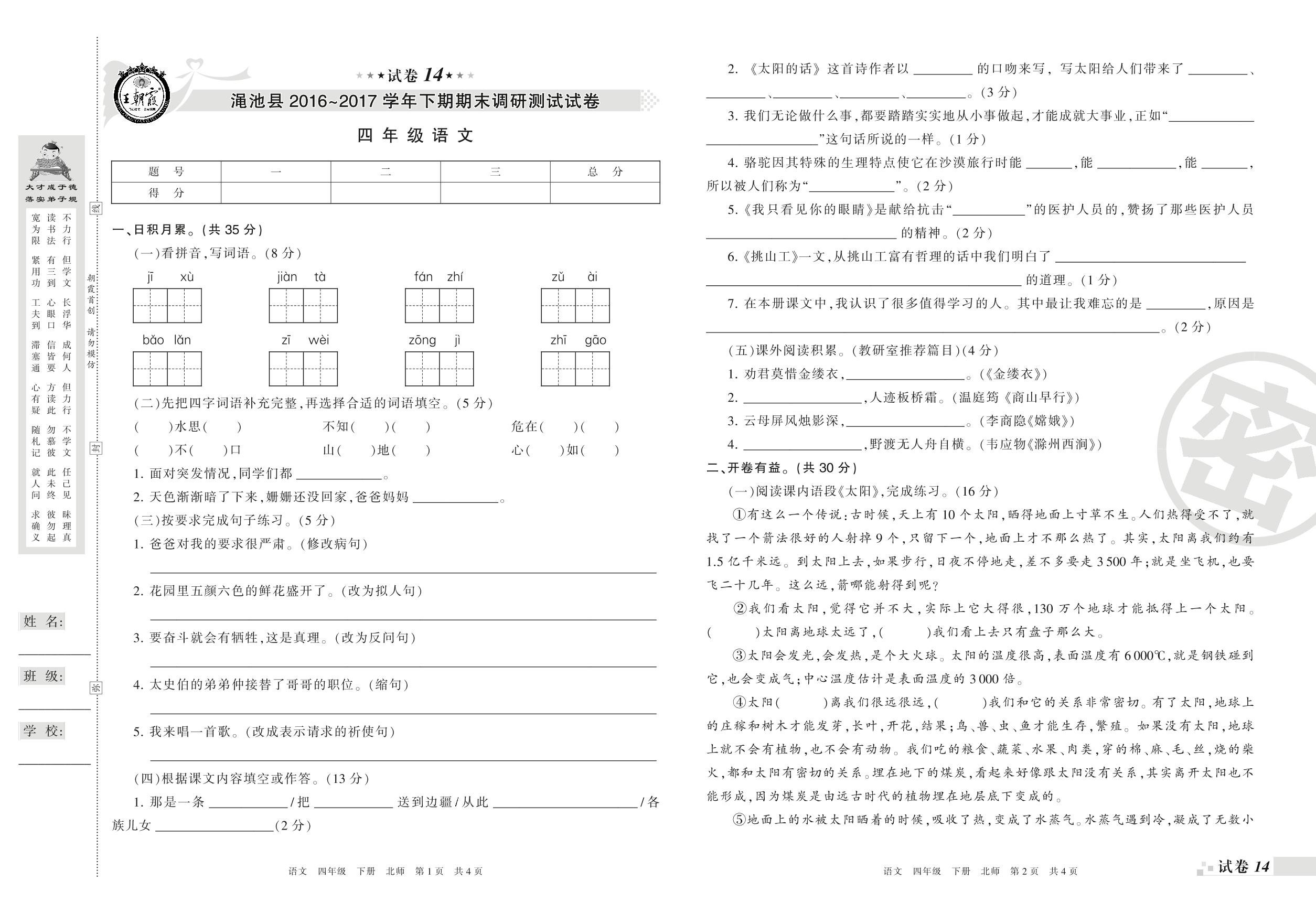 2016-2017学年第二学期三门峡市渑池县四年级语文试卷(北师版)【14】