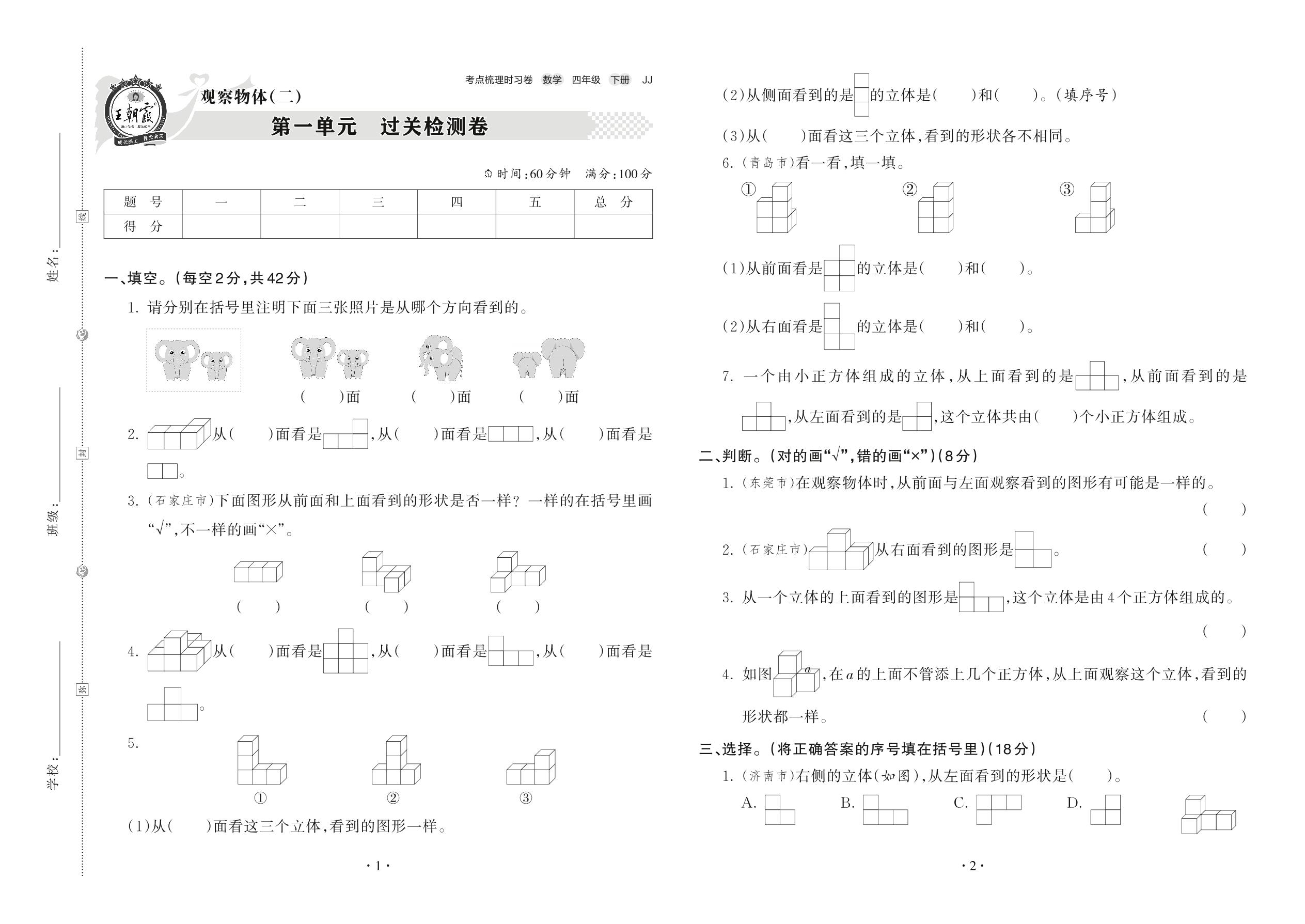 2022下册四年级数学冀教版 第一单元 过关检测卷