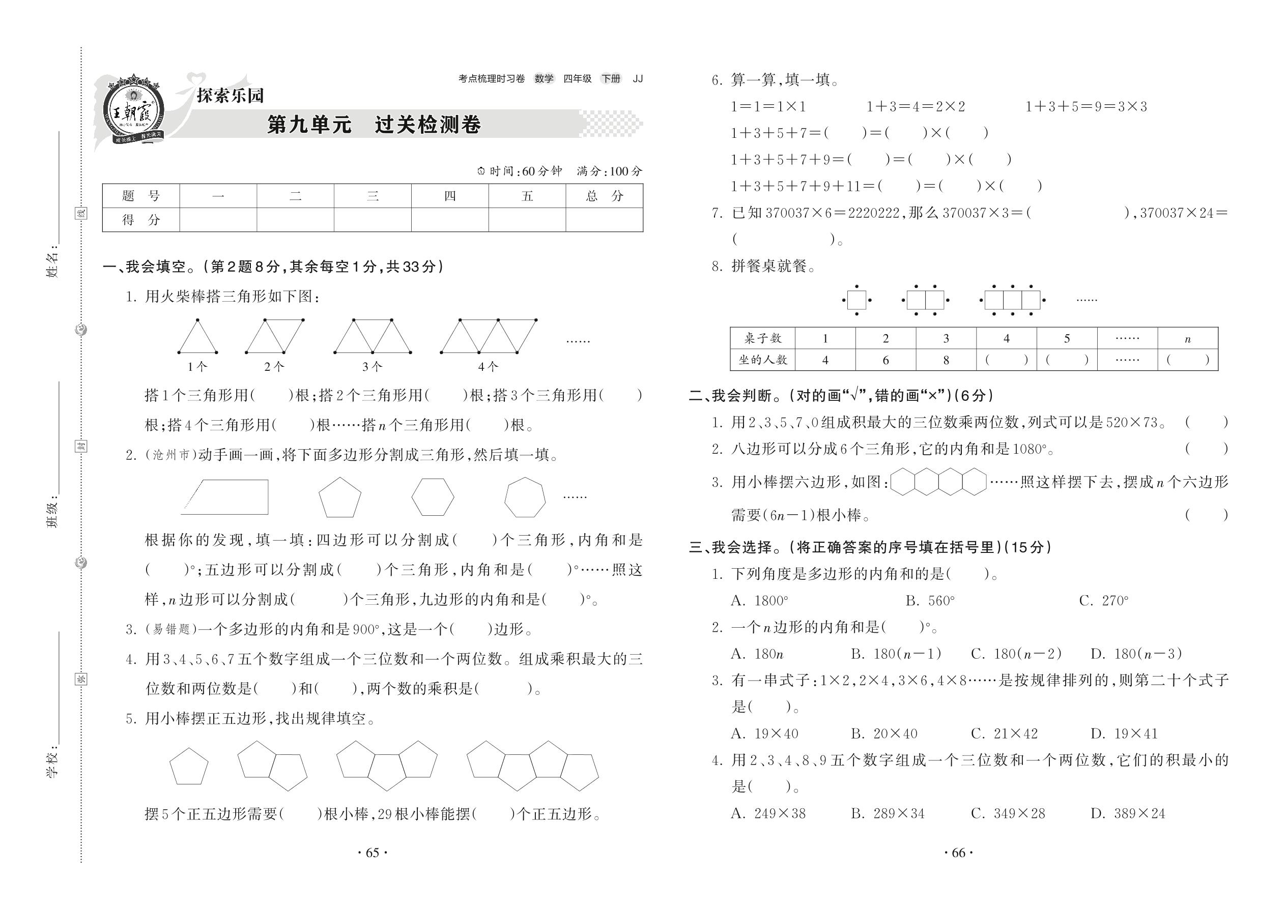 2022下册四年级数学冀教版 第九单元 过关检测卷