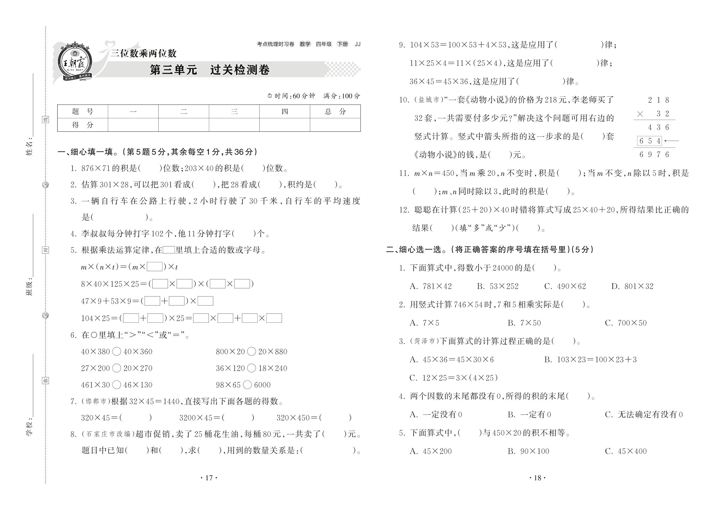 2022下册四年级数学冀教版 第三单元 过关检测卷