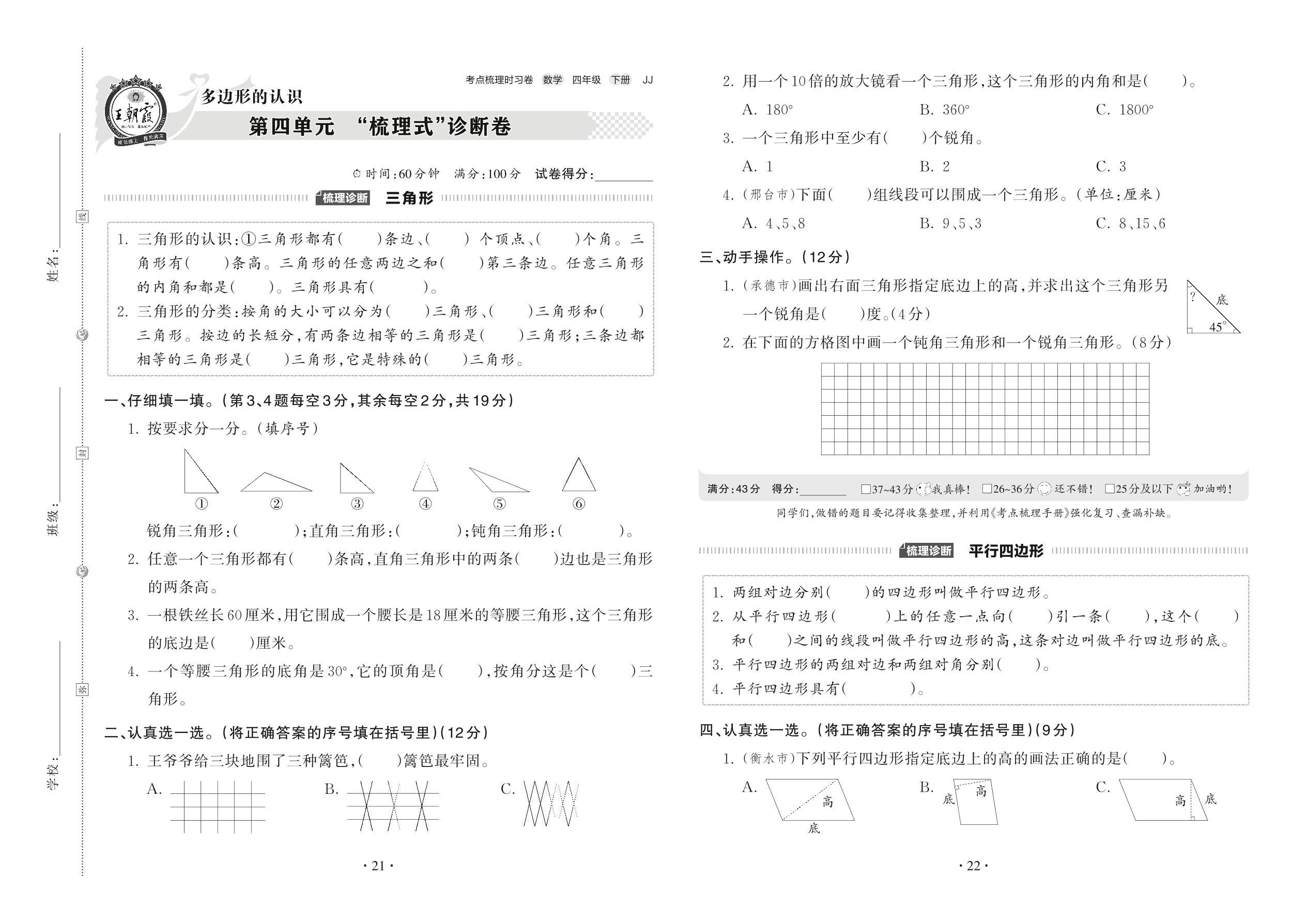 2022下册四年级数学冀教版 第四单元 “梳理式”诊断卷
