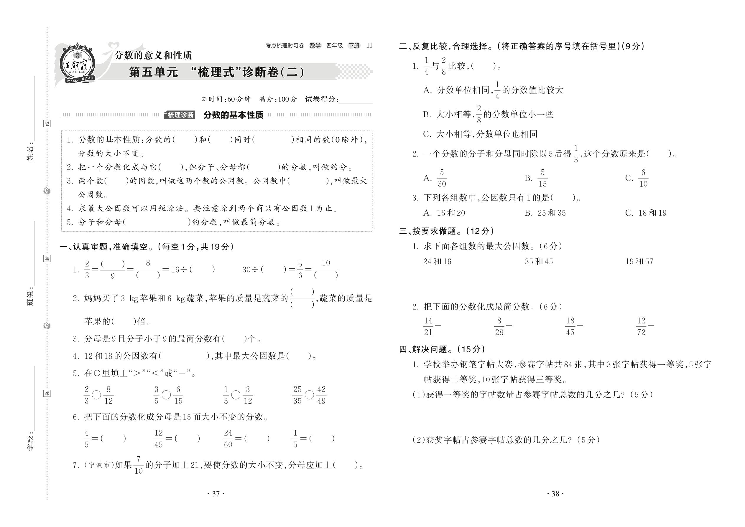 2022下册四年级数学冀教版 第五单元 “梳理式”诊断卷(二)