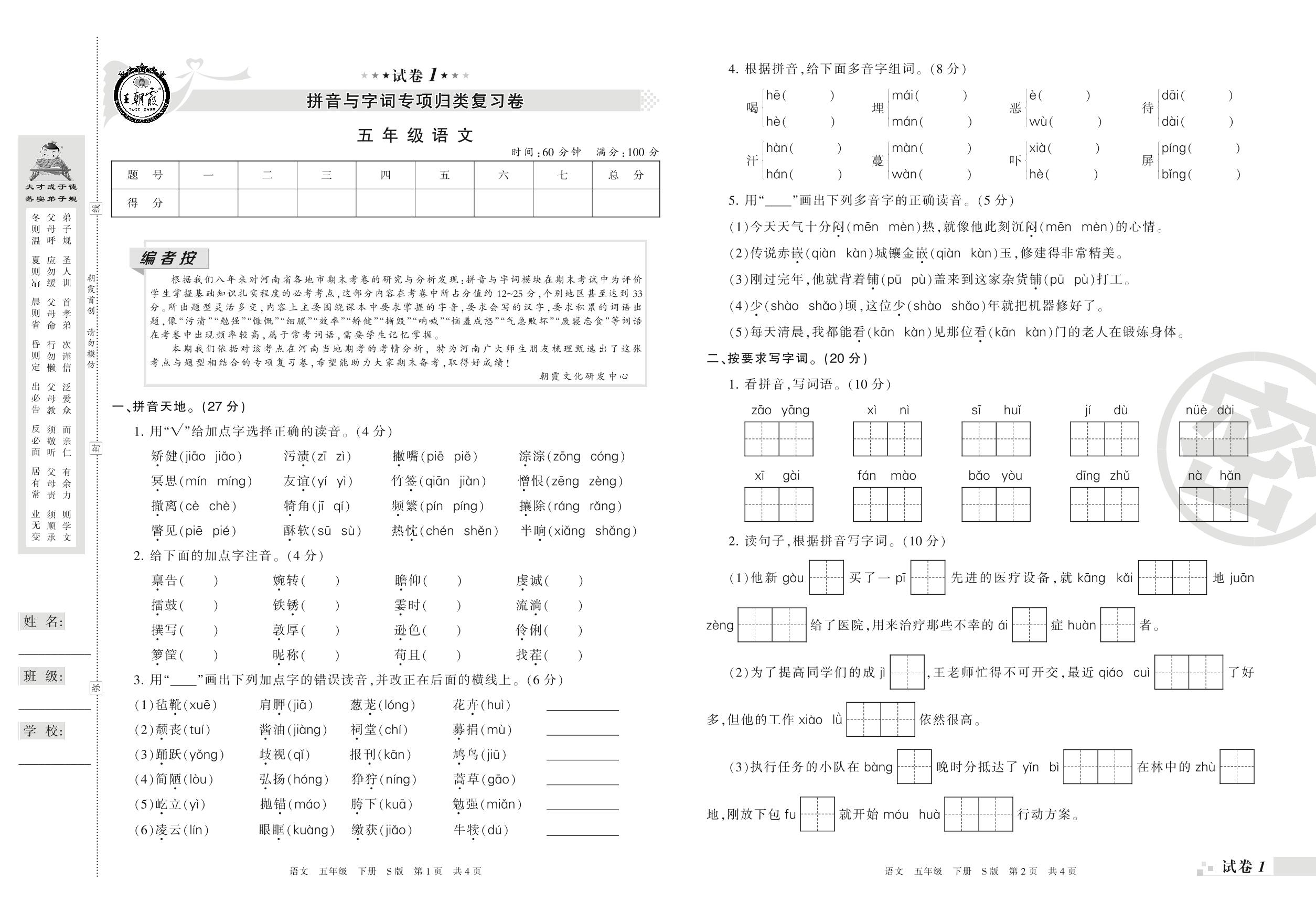 王朝霞期末专项卷——拼音与字词专项归类复习卷五年级下册语文(S版)_R210801230446【1】