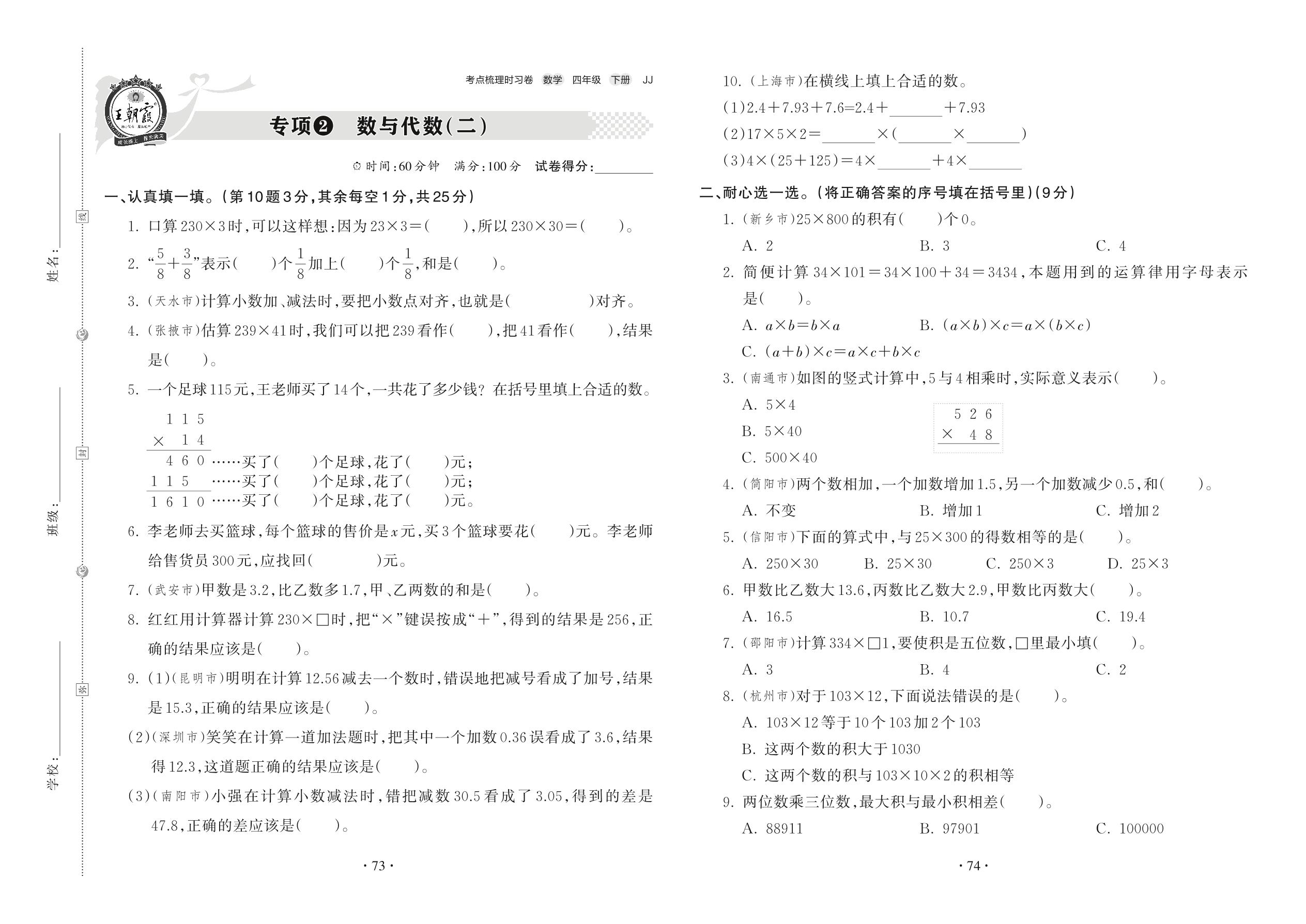 2022下册四年级数学冀教版 专项2 数与代数(二)