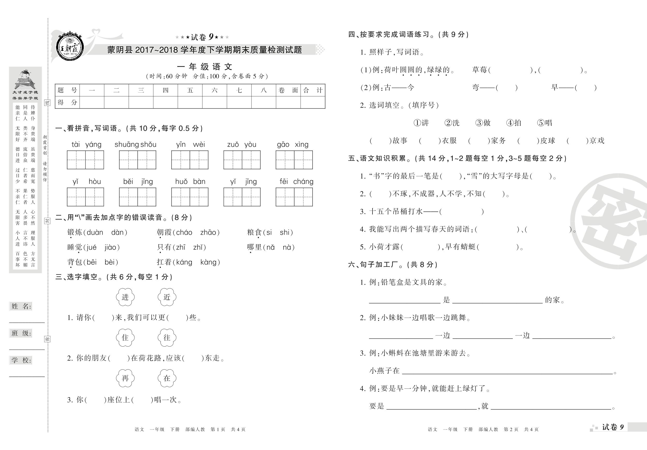 2017-2018学年第二学期临沂市蒙阴县一年级语文试卷(人教版)【9】