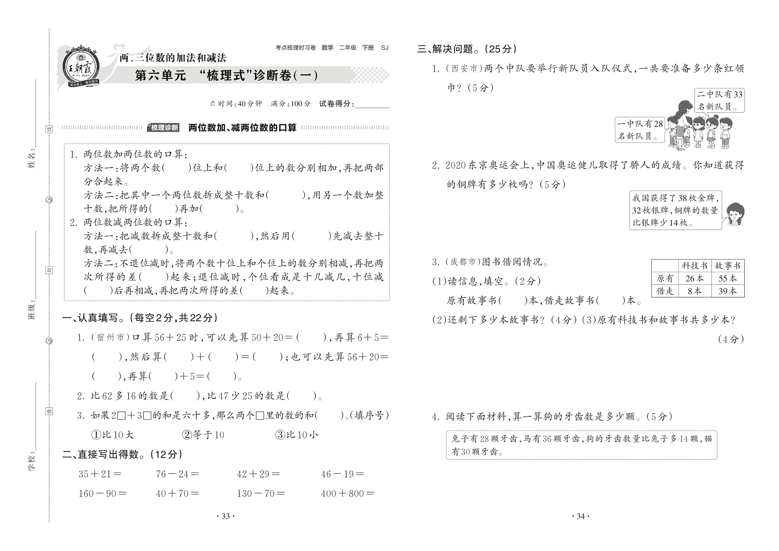 2022下册二年级数学苏教版 第六单元 “梳理式”诊断卷(一)