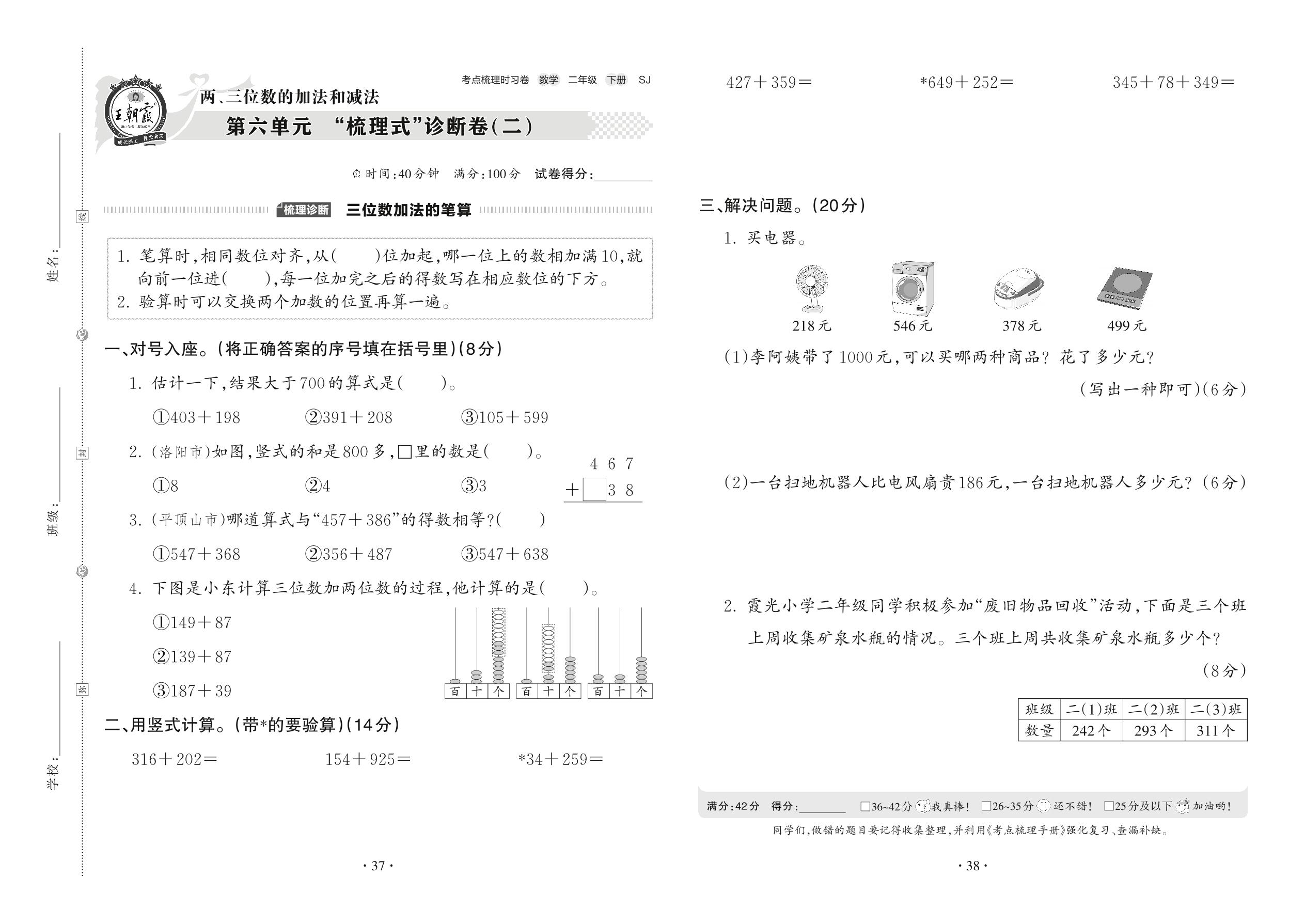 2022下册二年级数学苏教版 第六单元 “梳理式”诊断卷(二)