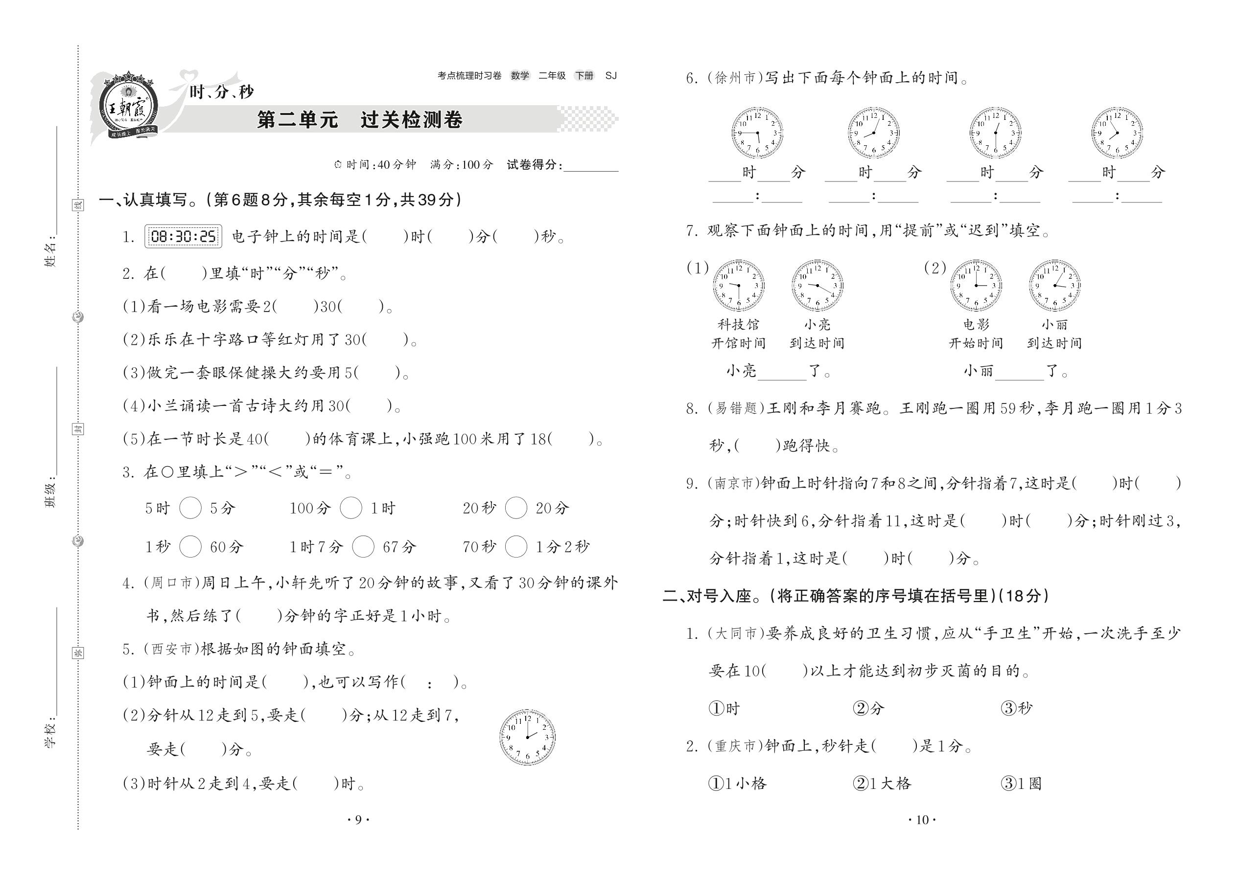 2022下册二年级数学苏教版 第二单元 过关检测卷