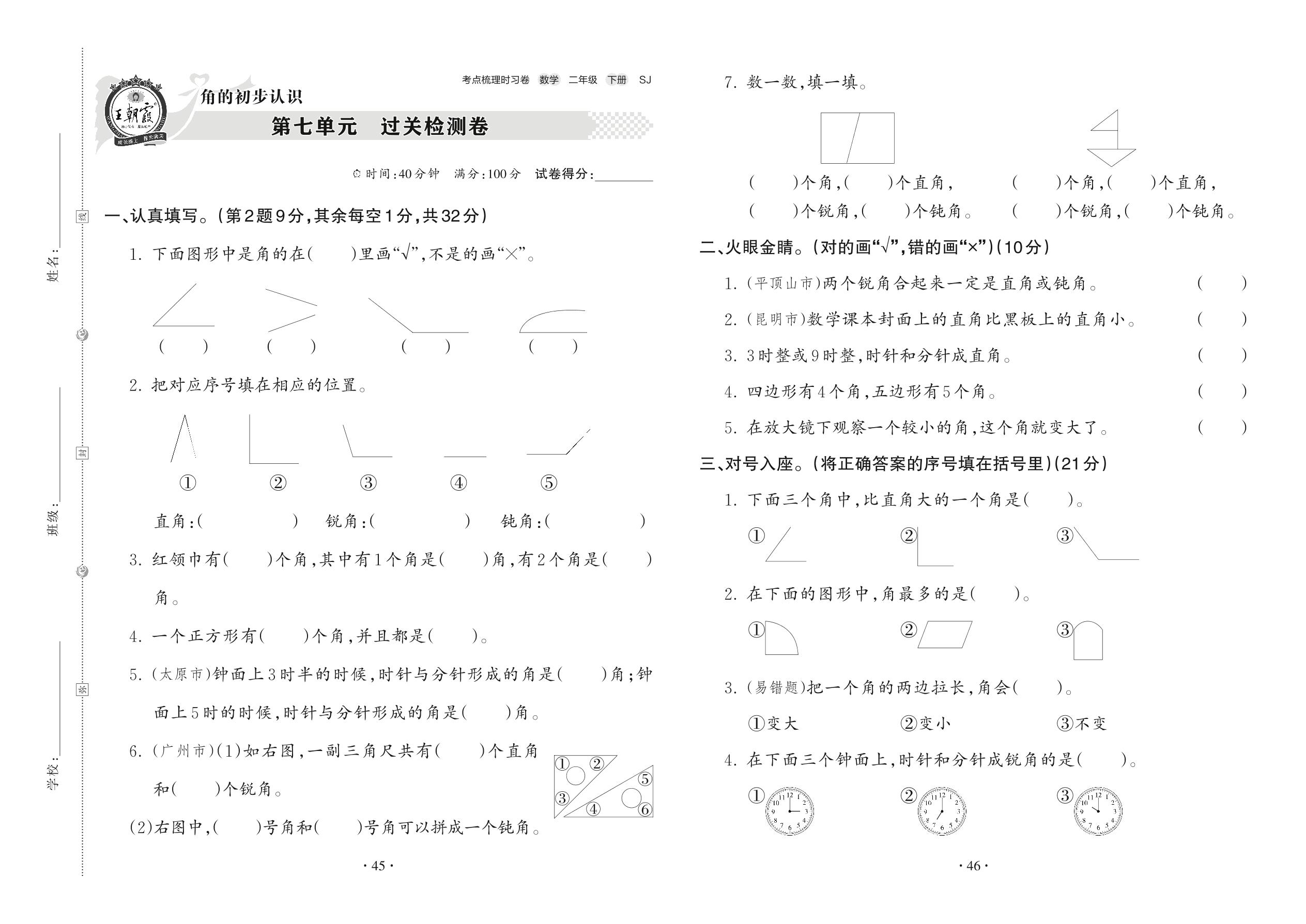 2022下册二年级数学苏教版 第七单元 过关检测卷