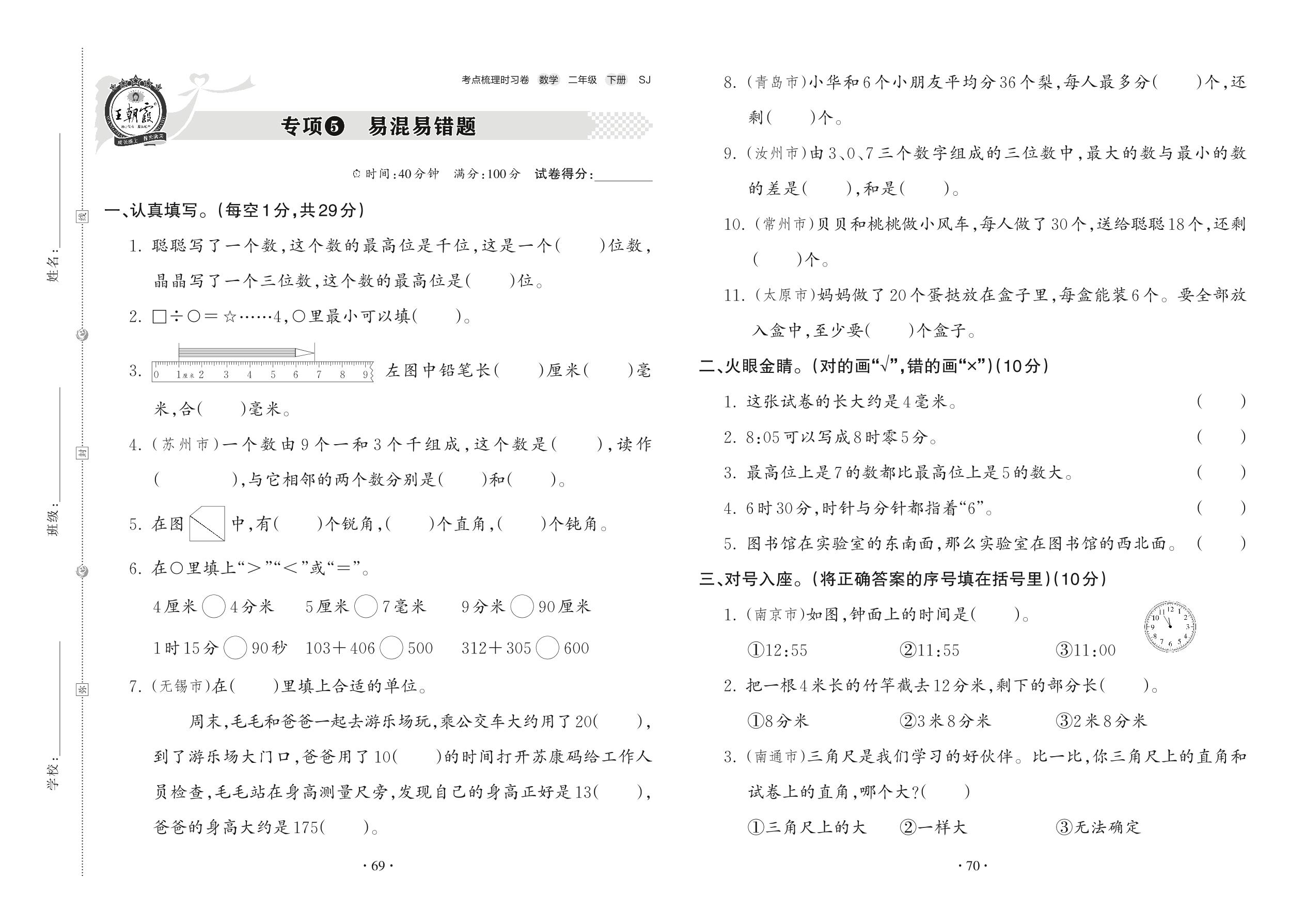 2022下册二年级数学苏教版 专项5 易混易错题