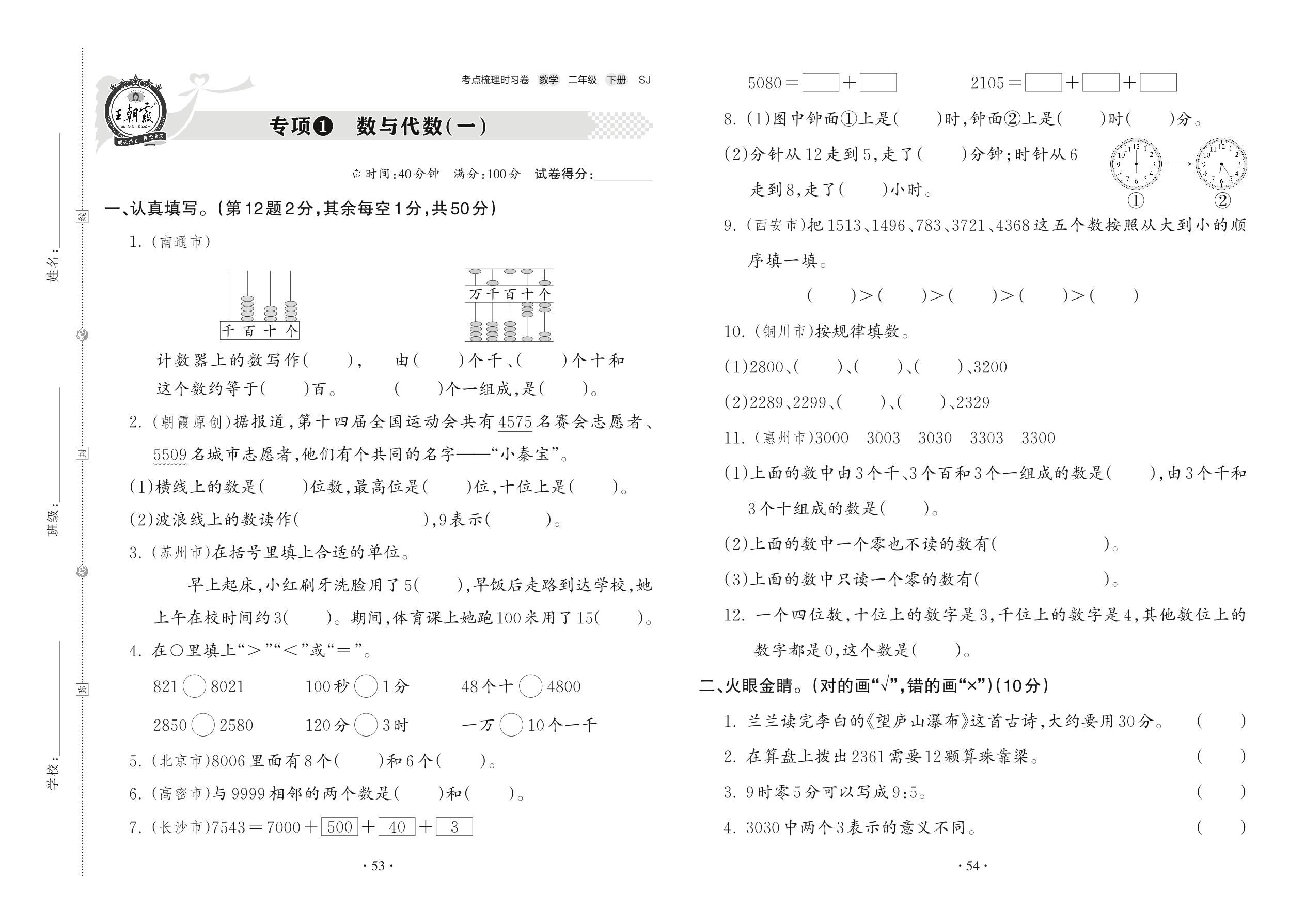 2022下册二年级数学苏教版 专项1 数与代数(一)
