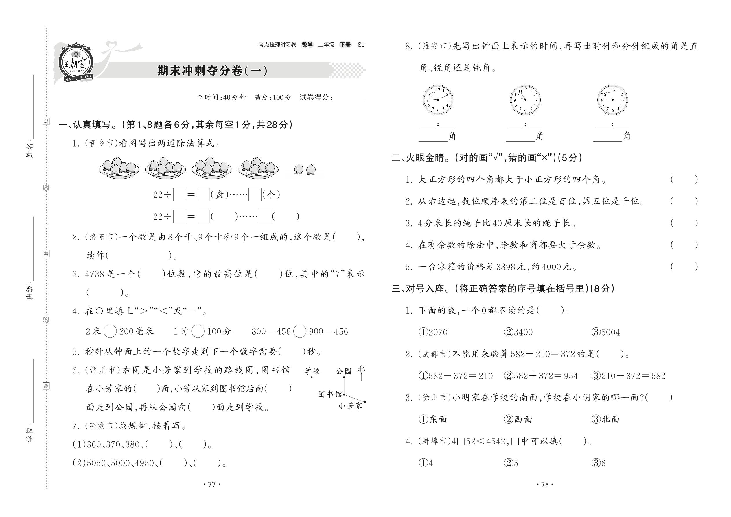 2022下册二年级数学苏教版 期末冲刺夺分卷(一)
