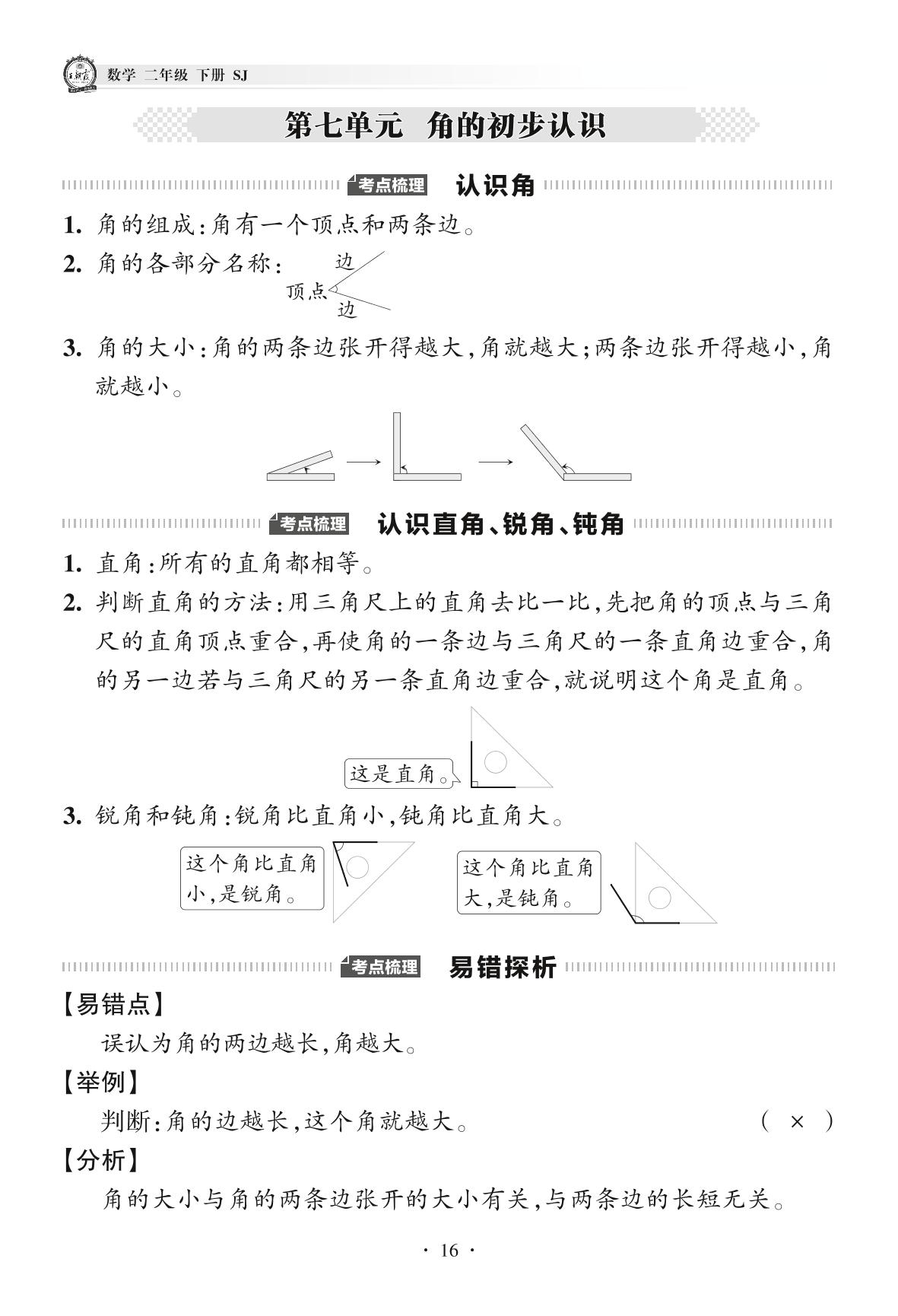 2022下册二年级数学苏教版 单元考点梳理——第七单元 角的初步认识