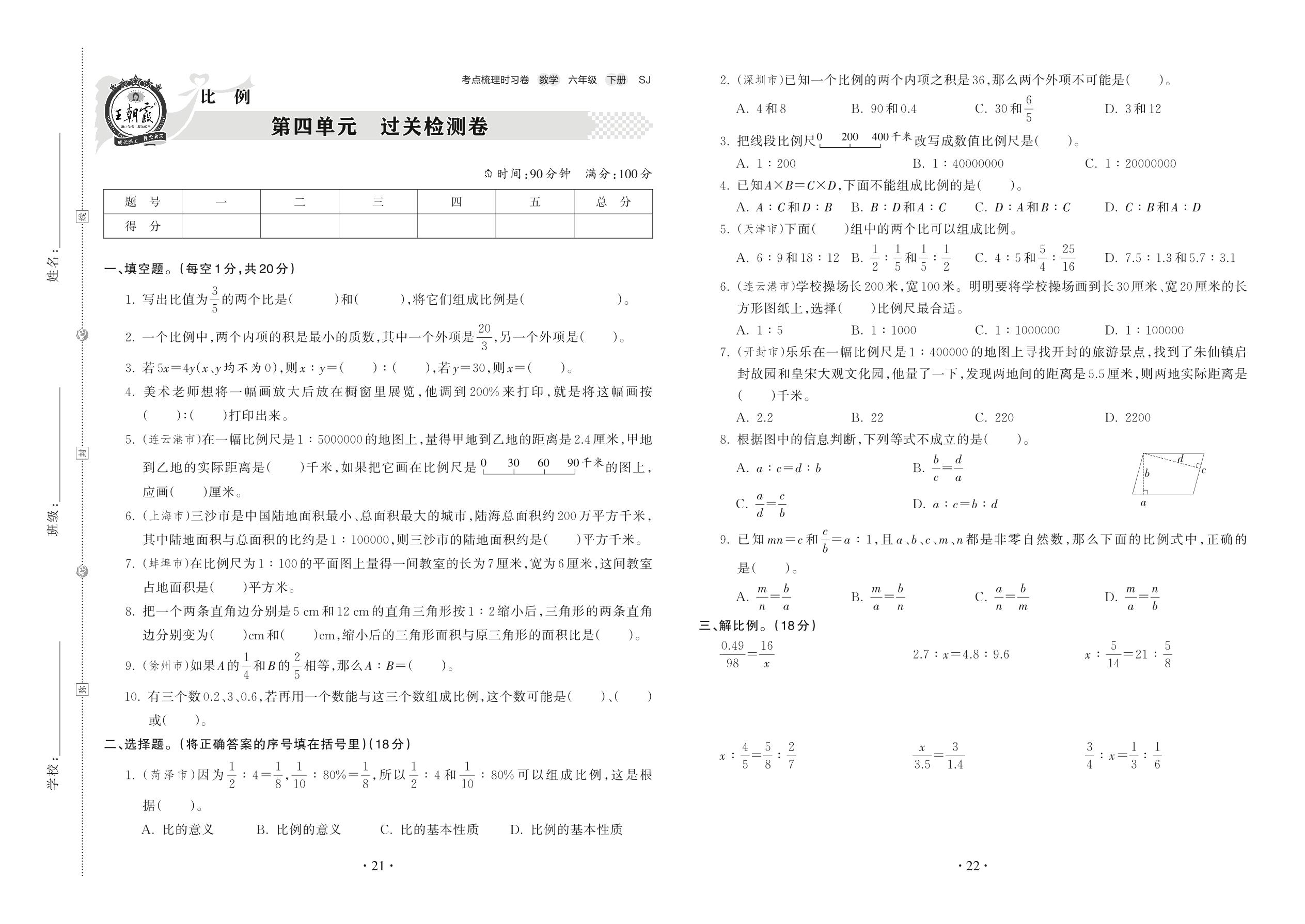 2022下册六年级数学苏教版 第四单元 过关检测卷