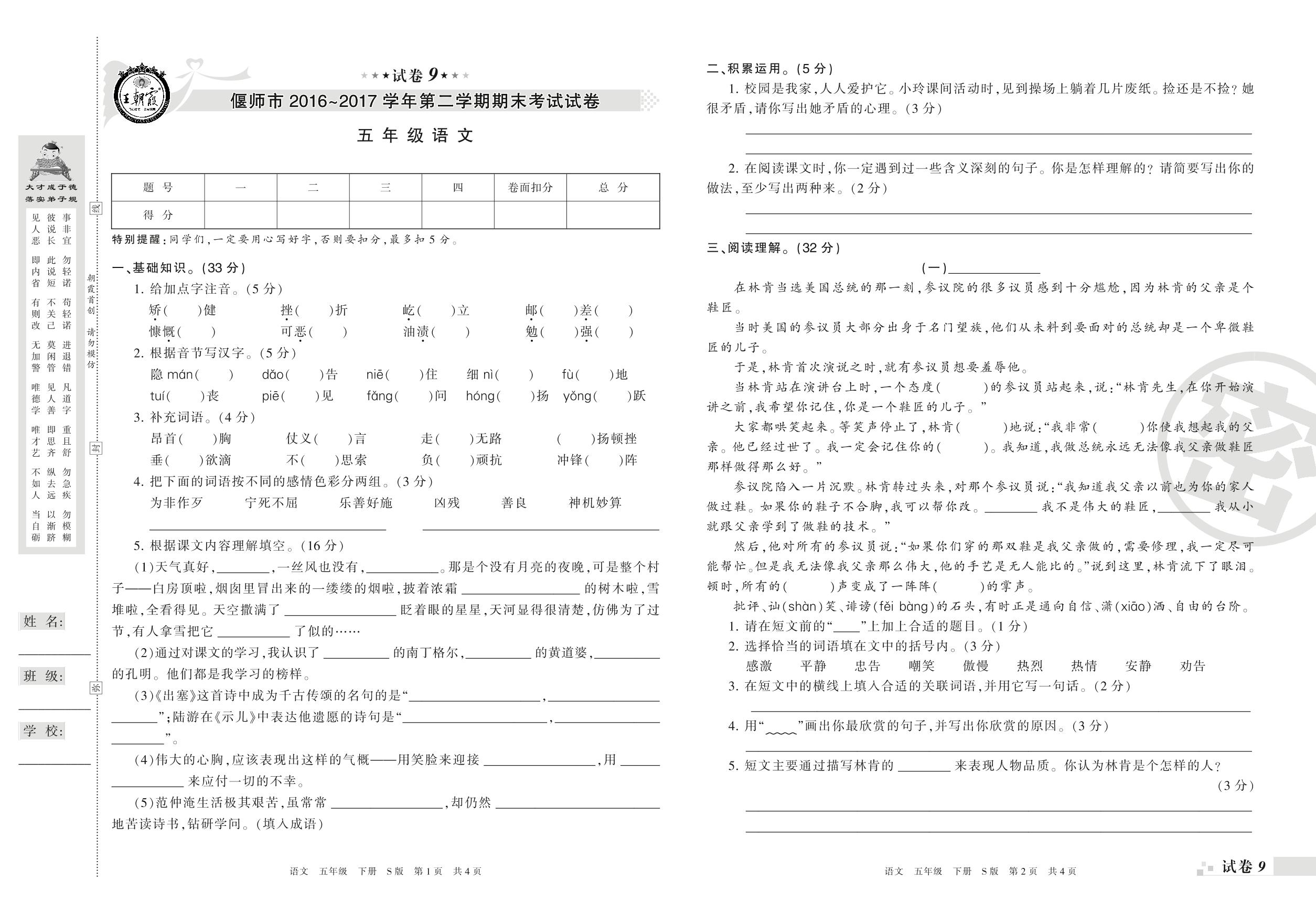 2016-2017学年第二学期偃师市五年级语文试卷(S版)【9】