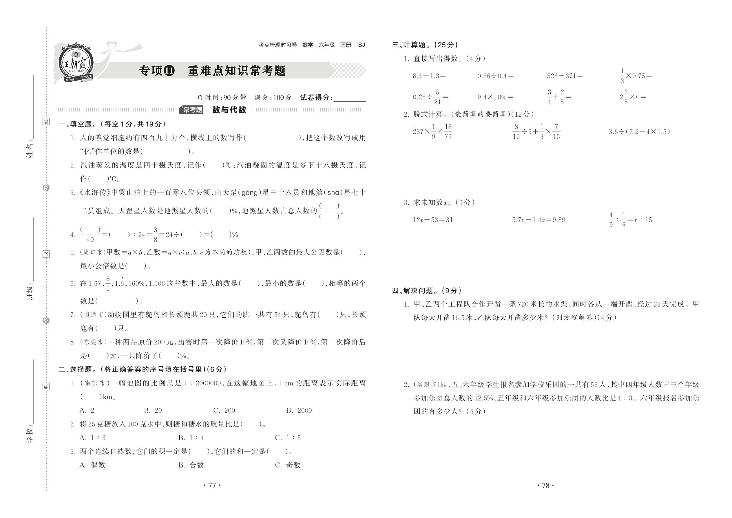 六年级数学苏教版下册专项卷
