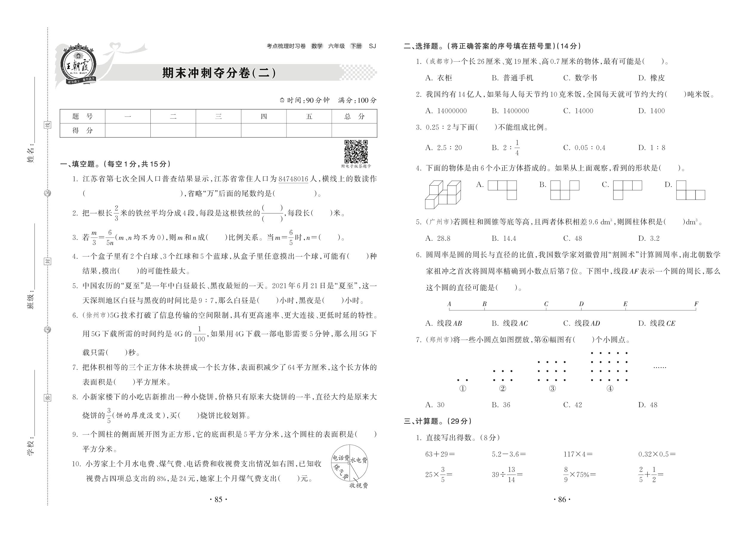 2022下册六年级数学苏教版 期末冲刺夺分卷(二)