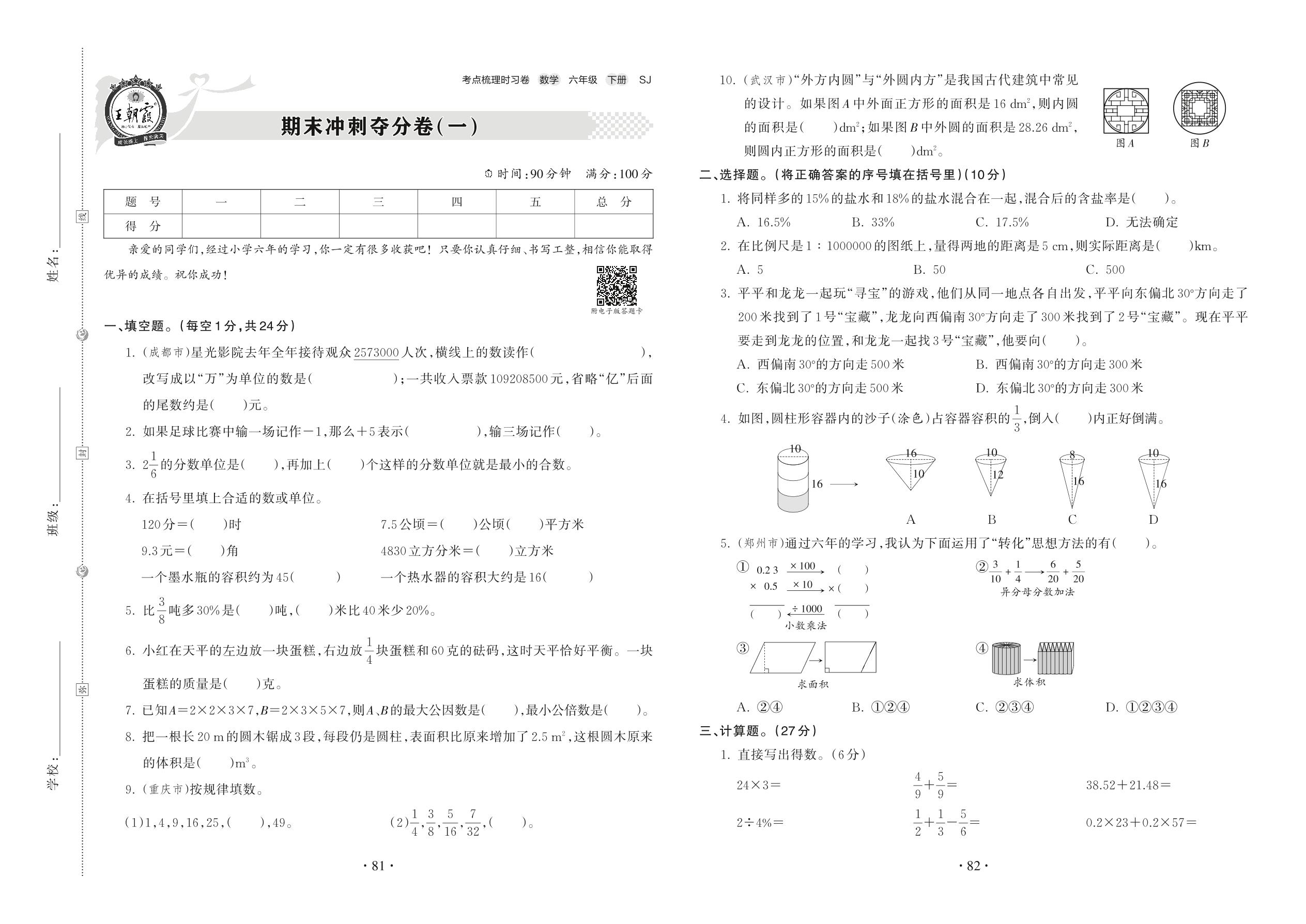 2022下册六年级数学苏教版 期末冲刺夺分卷(一)
