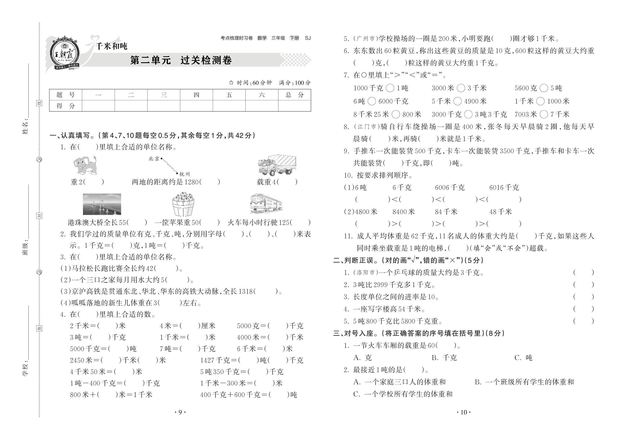 2022下册三年级数学苏教版 第二单元 过关检测卷