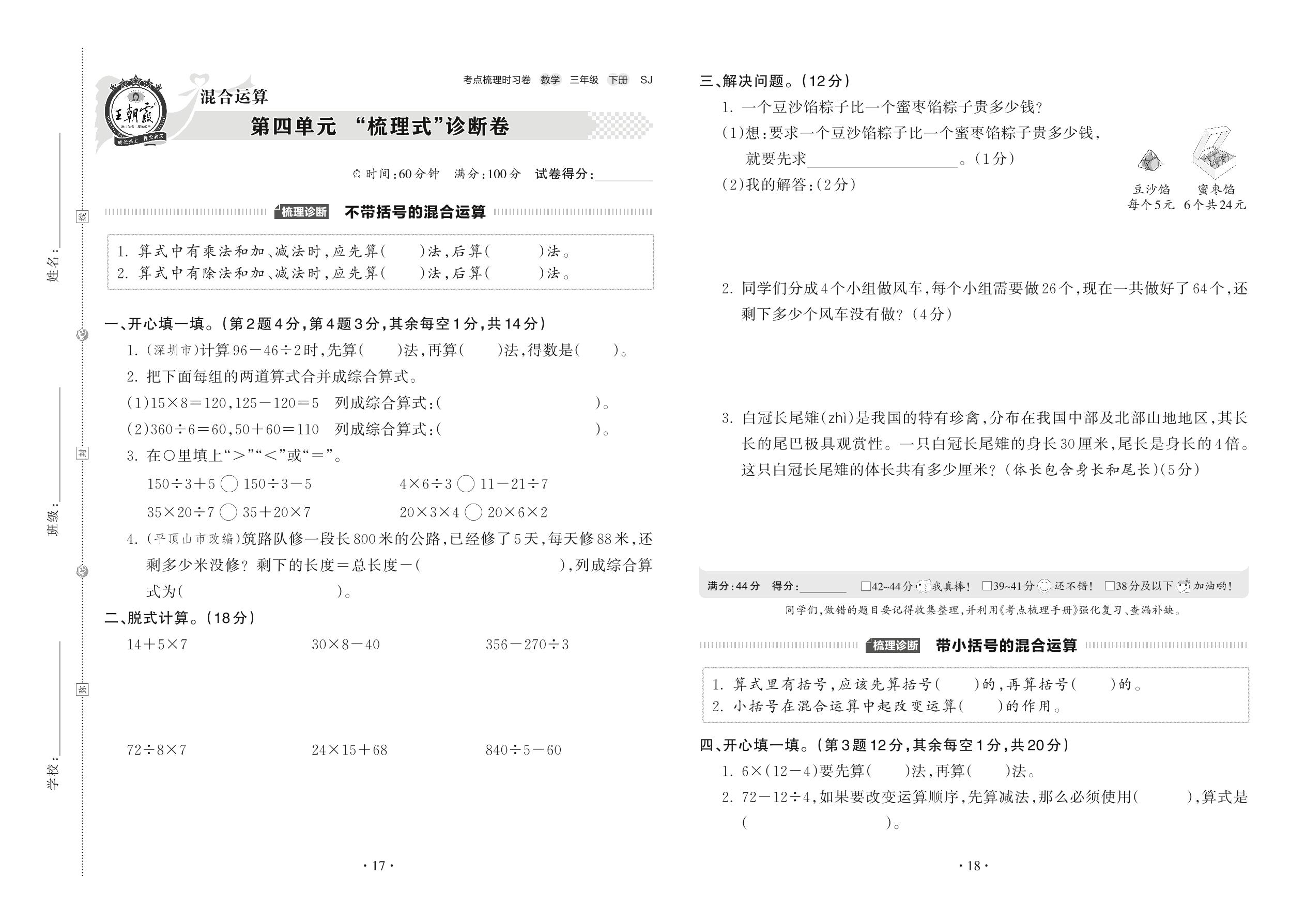 2022下册三年级数学苏教版 第四单元 “梳理式”诊断卷