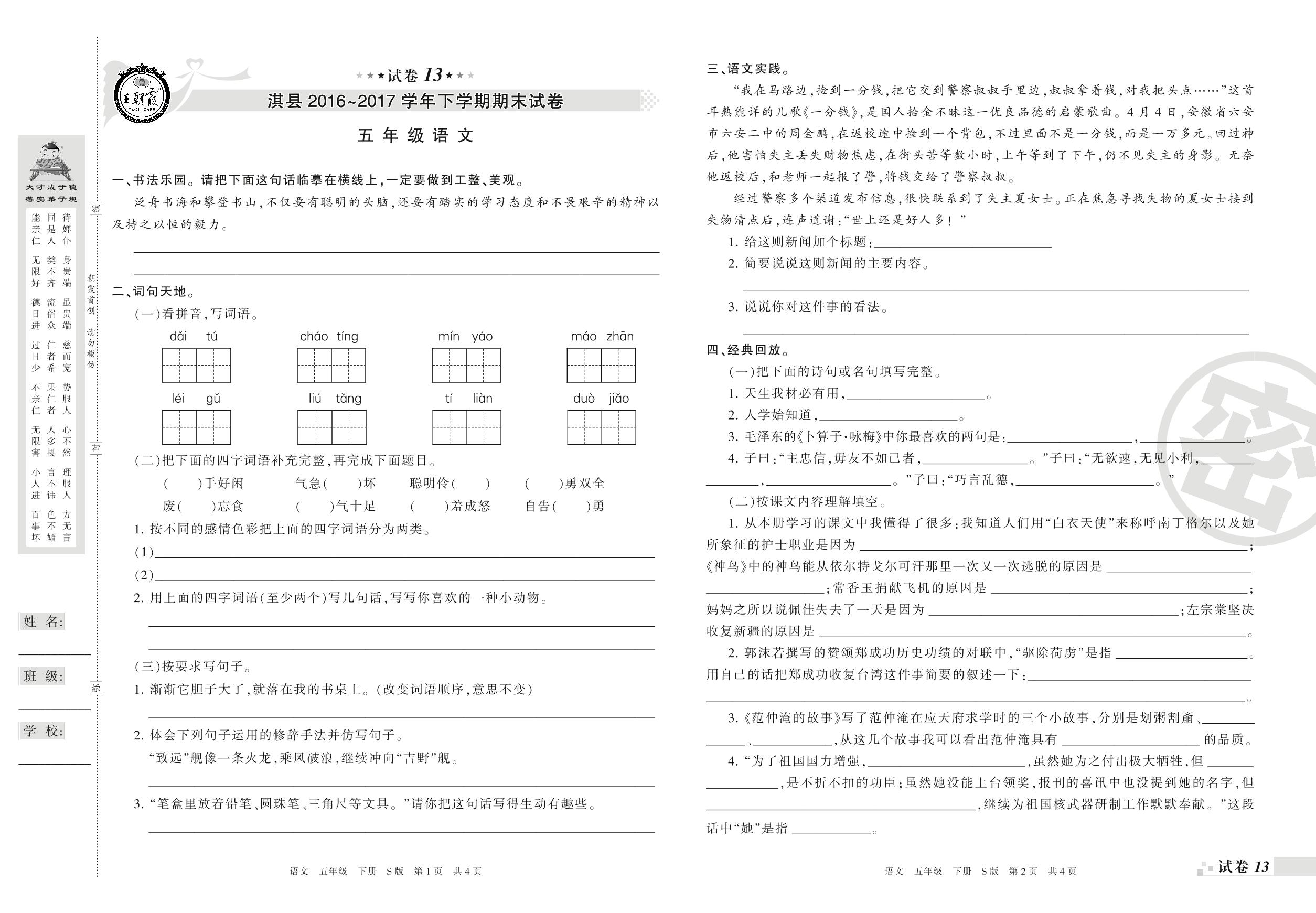 2016-2017学年第二学期鹤壁市淇县五年级语文试卷(S版)【13】