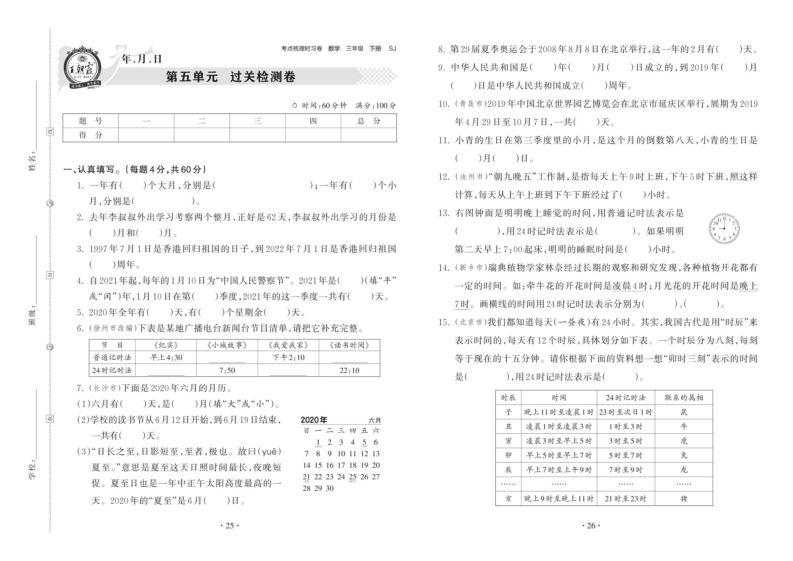 2022下册三年级数学苏教版 第五单元 过关检测卷