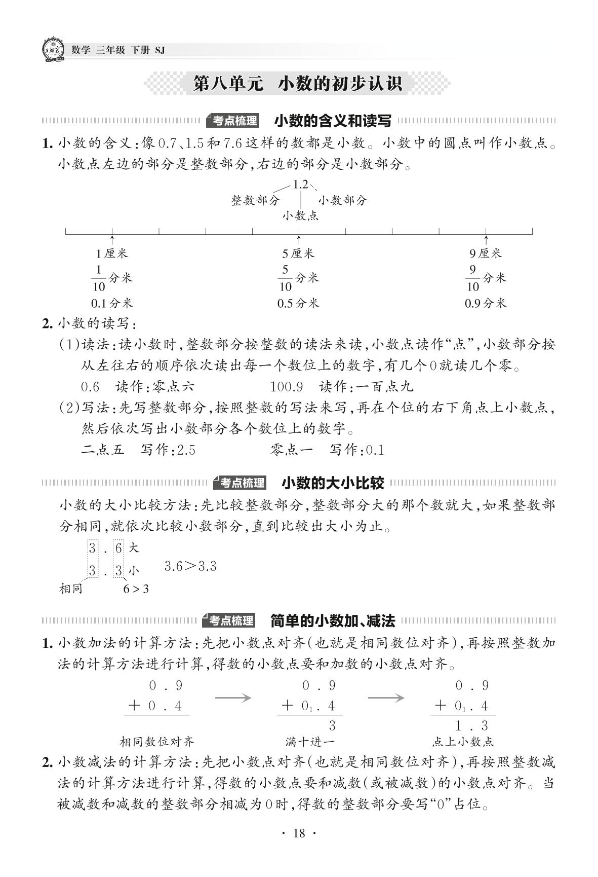 2022下册三年级数学苏教版 单元考点梳理——第八单元 小数的初步认识