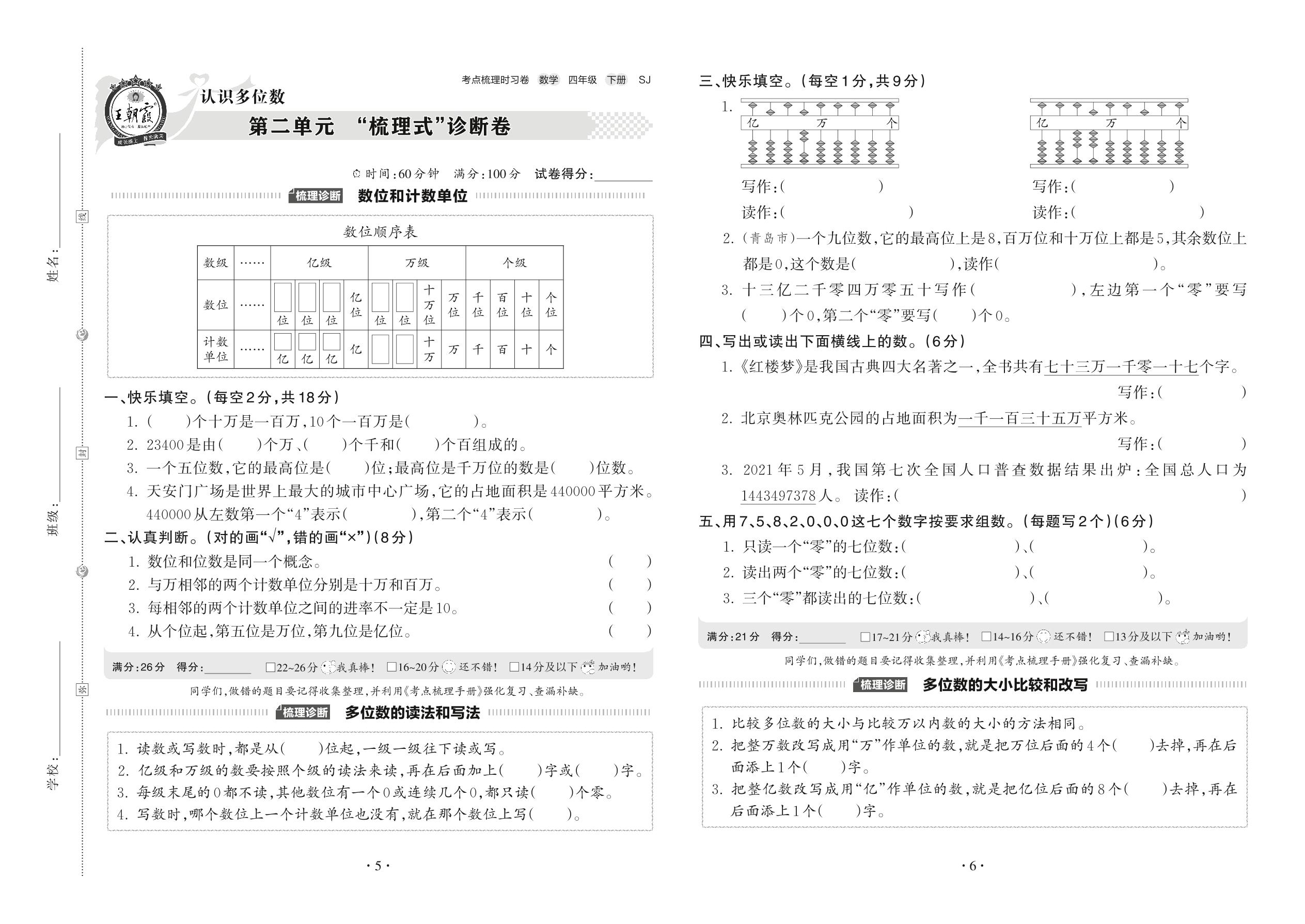 2022下册四年级数学苏教版 第二单元 “梳理式”诊断卷