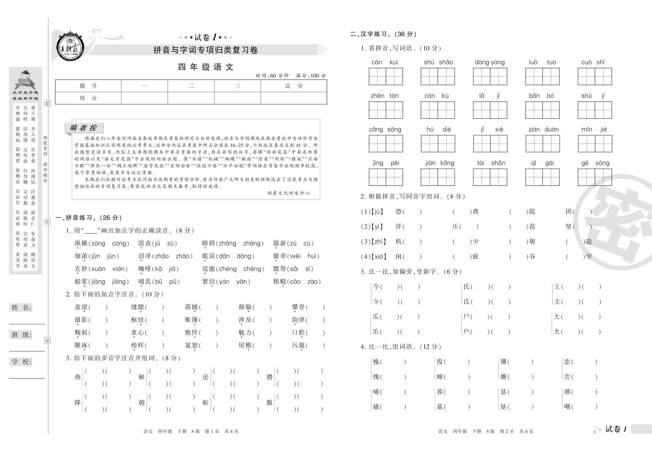 王朝霞期末专项卷——拼音与字词专项归类复习卷四年级下册语文(S版)_R210801230531【1】