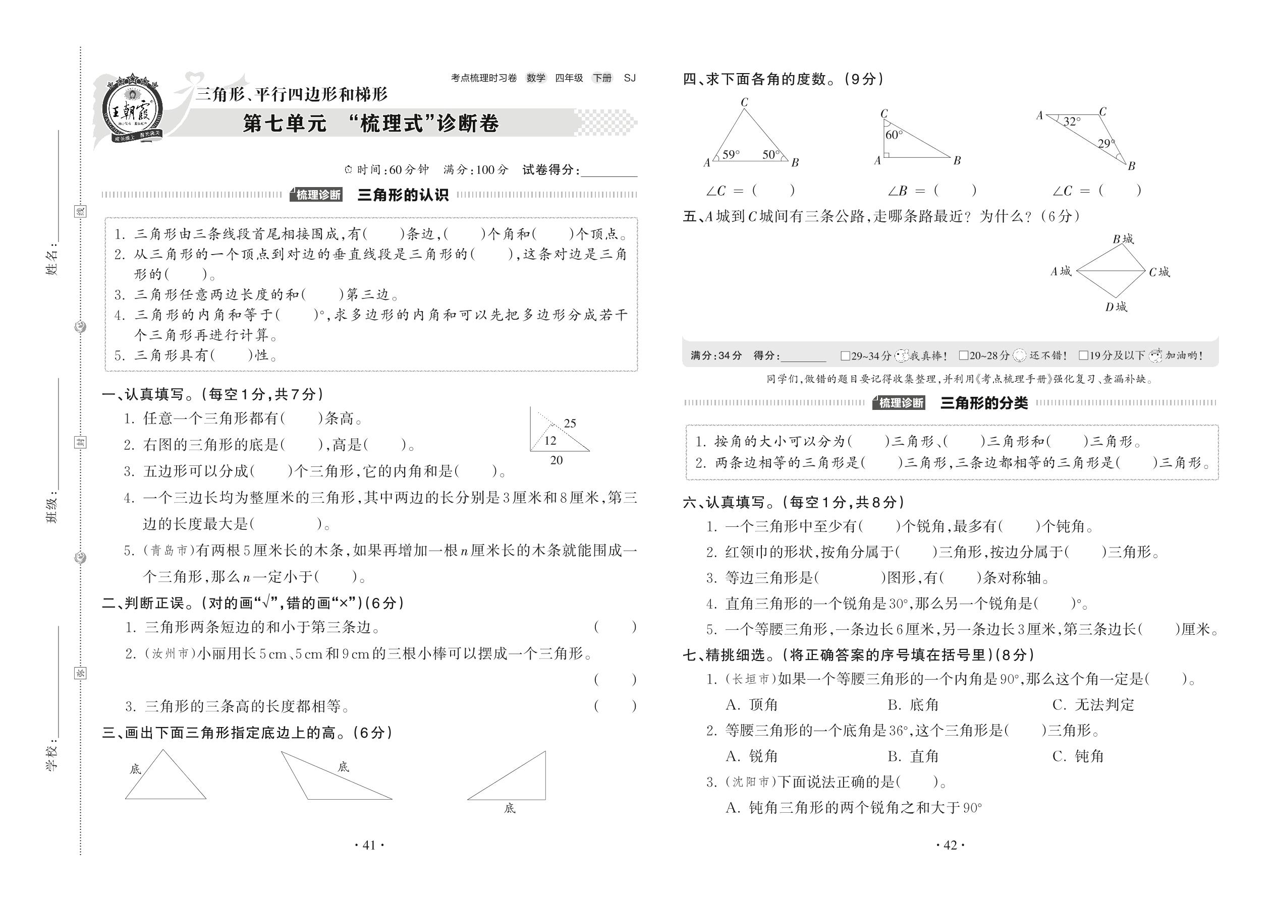 2022下册四年级数学苏教版 第七单元 “梳理式”诊断卷