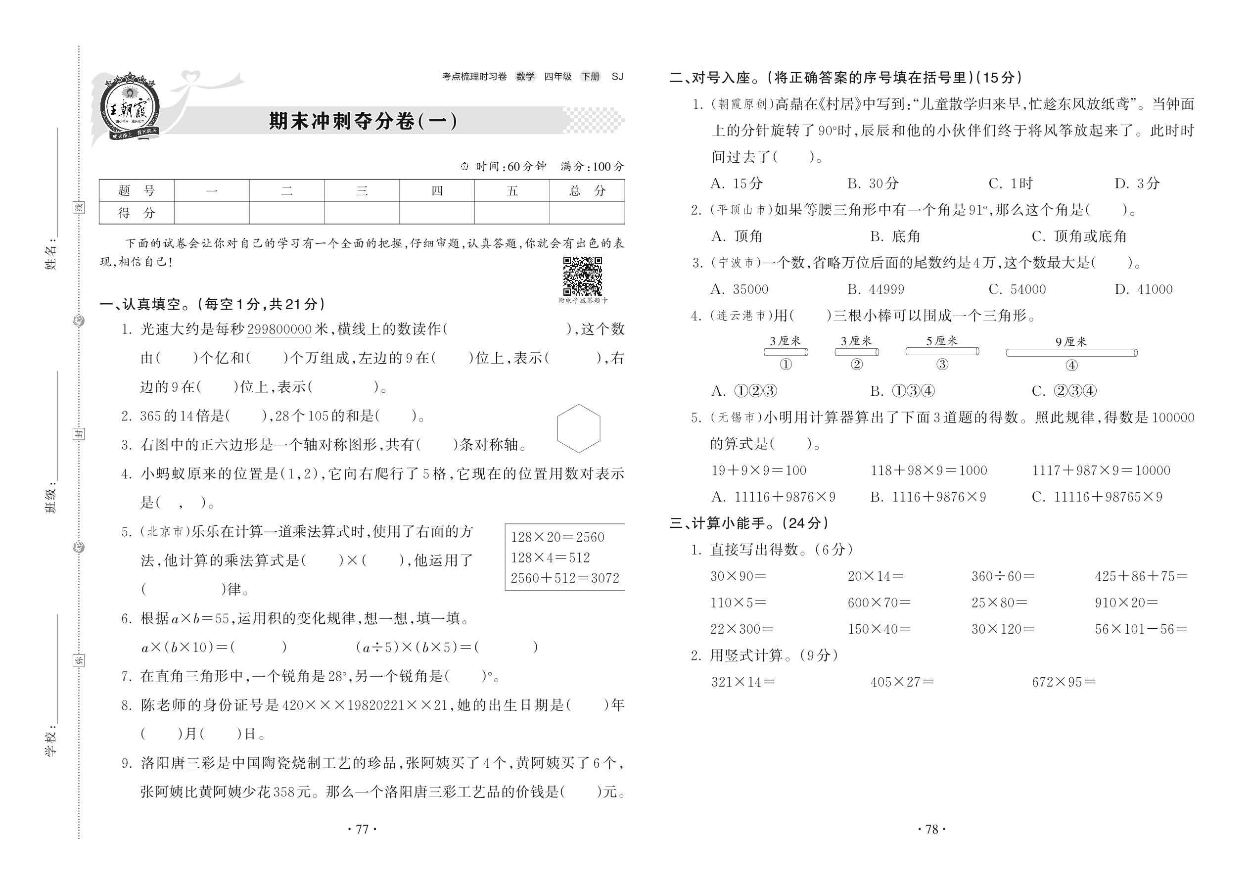 2022下册四年级数学苏教版 期末冲刺夺分卷(一)