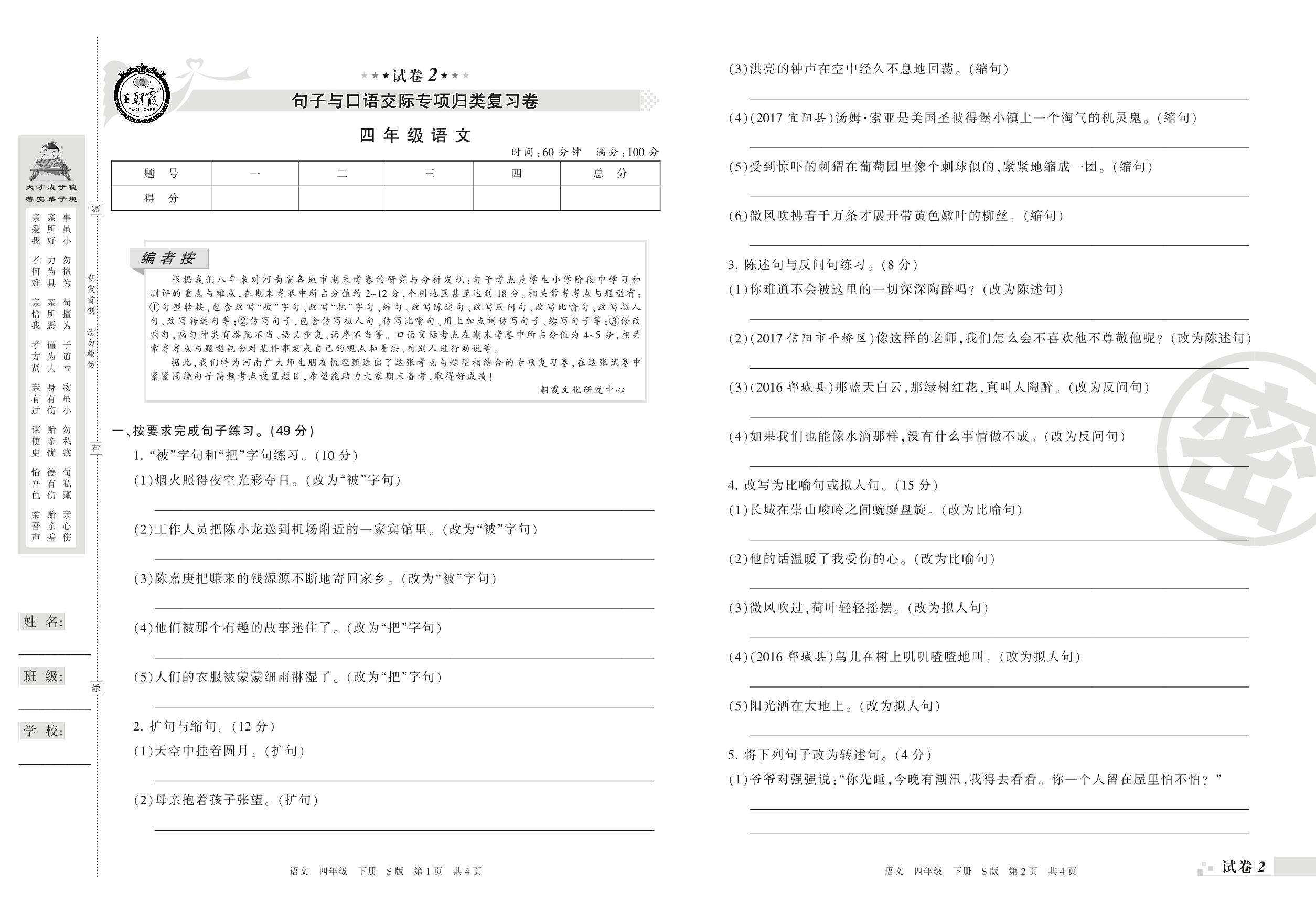 王朝霞期末专项卷——句子与口语交际专项归类复习卷四年级下册语文(S版)_R210801230534【2】