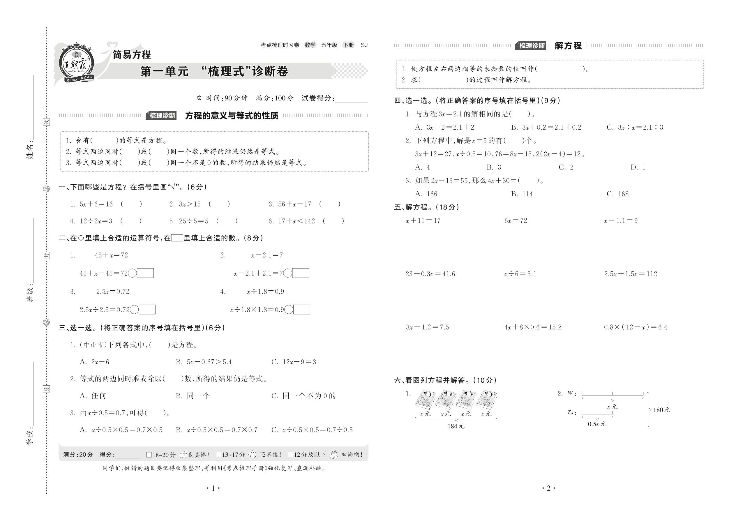 2022下册五年级数学苏教版 第一单元 “梳理式”诊断卷