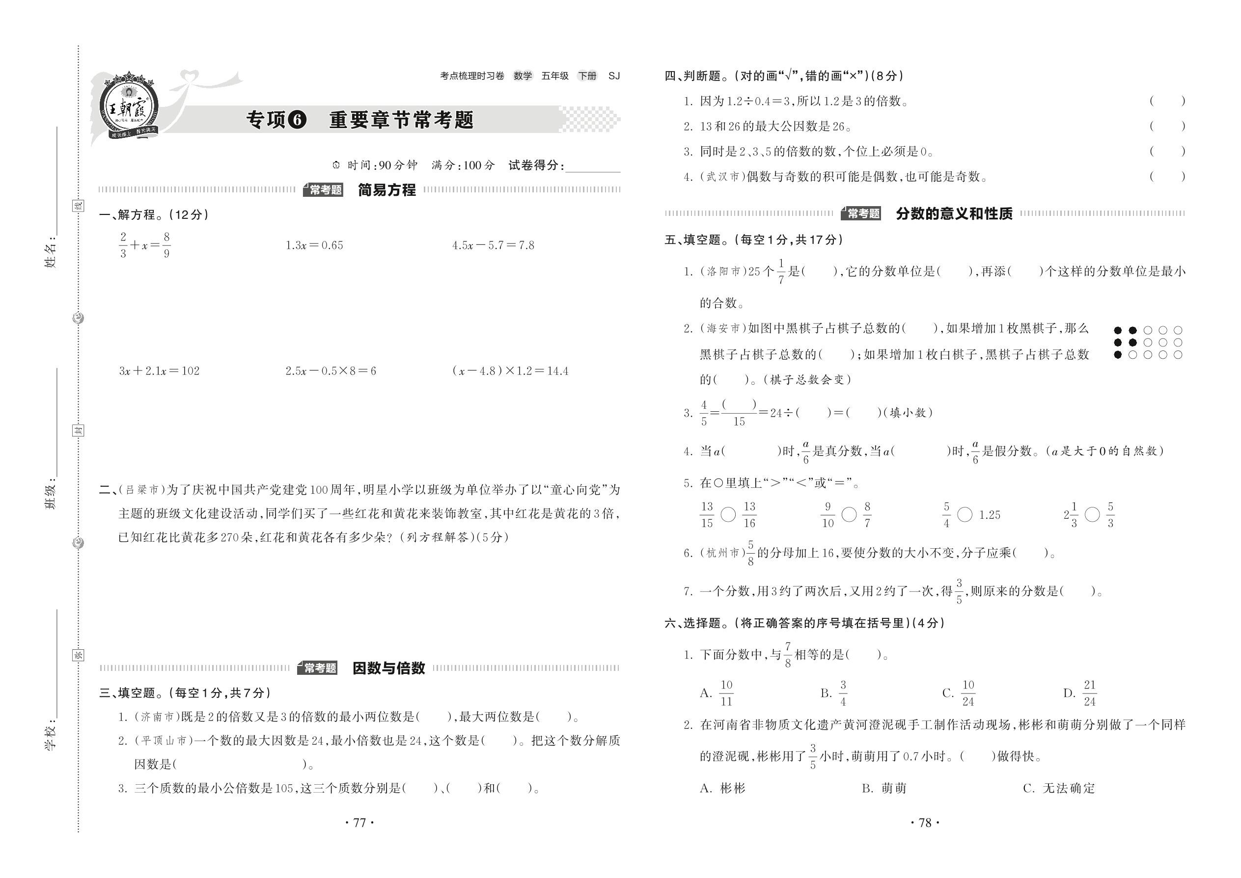 2022下册五年级数学苏教版 专项6 重要章节常考题